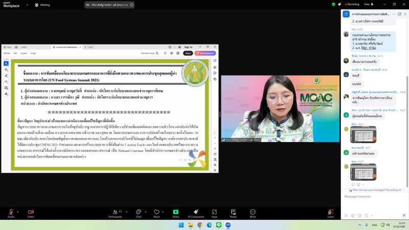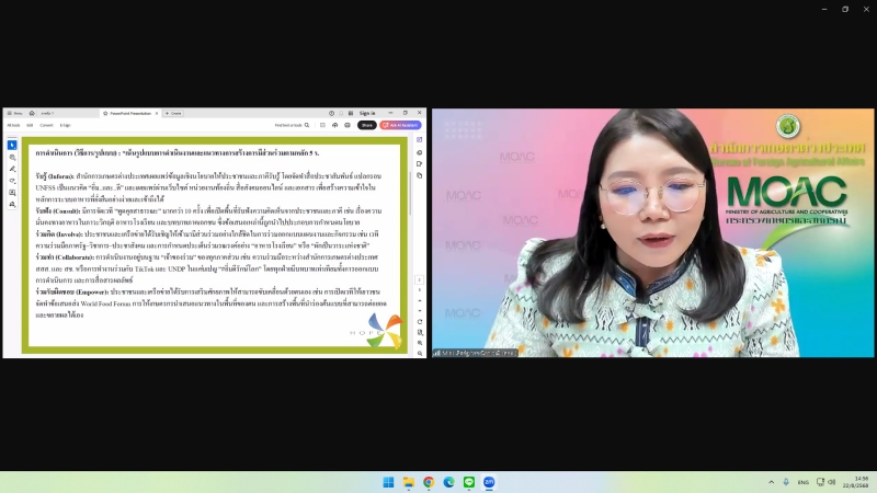วันที่ 22 สิงหาคม 2568 นางสาววรรณิกา วุฒิ นักวิเคราะห์นโยบายและแผนชำนาญการ ผู้แทนสำนักการเกษตรต่างประเทศ นำเสนอผลงานในการประกวด Mini เลิศรัฐ ประจำปีงบประมาณ 2568 ในหัวข้อ “การขับเคลื่อนนโยบายระบบเกษตรและอาหารที่ยั่งยืนตามแนวทางของ UN Food Systems Summit 2021” ซึ่งเป็นผลงานที่สะท้อนการบูรณาการการทำงานแบบมีส่วนร่วม ผ่านกลไก “5 ร.” ได้แก่ รับรู้ รับฟัง ร่วมคิด ร่วมทำ และร่วมรับผิดชอบ โดยได้รับความร่วมมือจากเครือข่ายทั้งในประเทศและต่างประเทศกว่า 30 องค์กร อีกทั้งข้อเสนอจากเวทีภาคประชาชนได้ถูกนำไปบรรจุใน แผนปฏิบัติการด้านการจัดการอาหารแห่งชาติ (พ.ศ. 2566–2570) ตลอดจนการสื่อสารสาธารณะภายใต้แนวคิด “อิ่ม และ ดี” และการรณรงค์ผ่านสื่อสังคมออนไลน์ (TikTok) ภายใต้แคมเปญ อิ่มดีรักษ์โลก มียอดเข้าชมมากกว่า 53 ล้านครั้ง ซึ่งสะท้อนถึงความสำเร็จของการขับเคลื่อนเชิงนโยบายและการสร้างแรงบันดาลใจให้แก่คนรุ่นใหม่ในการร่วมเปลี่ยนผ่านระบบอาหารสู่ความยั่งยืน