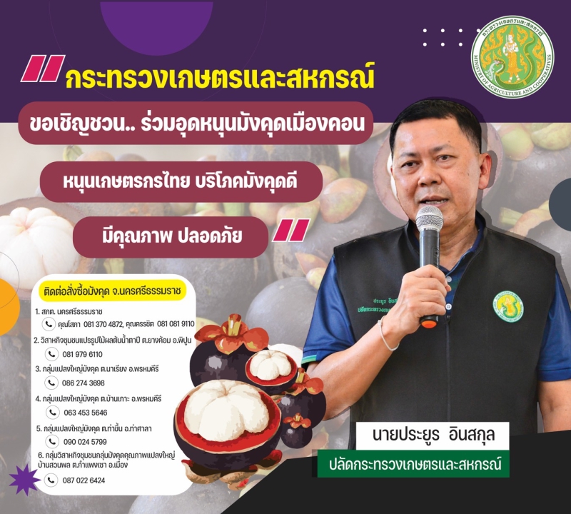 นายประยูร อินสกุล ปลัดกระทรวงเกษตรและสหกรณ์ เป็นประธานการประชุมหารือแนวทางการขยายช่องทางการกระจายผลผลิตมังคุดภาคใต้ที่จะออกสู่ตลาด เน้นการผลิตมังคุดคุณภาพ โดยมี นายสุรเดช สมิเปรม รองปลัดกระทรวงเกษตรและสหกรณ์ นายภัสชญภณ หมื่นแจ้ง รองอธิบดีกรมวิชาการเกษตร นายปณิธาน มีไชยโย ผู้อำนวยองค์การตลาดเพื่อเกษตรกร (อ.ต.ก.) นางสาววิภาวลี วัจจนาภิญโญ นายกสมาคมผู้ประกอบการพืชผักผลไม้ไทย พร้อมด้วยผู้แทนกรมส่งเสริมการเกษตร กรมส่งเสริมสหกรณ์ และผู้แทนหน่วยงานกระทรวงเกษตรและสหกรณ์ในพื้นที่ภาคใต้ (นครศรีธรรมราช สุราษฎร์ธานี ชุมพร ระนอง และสงขลา) เข้าร่วมการประชุม ณ ห้องประชุมองค์การตลาดเพื่อเกษตรกร จตุจักร กรุงเทพฯ และผ่านการประชุมออนไลน์