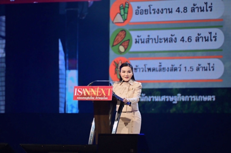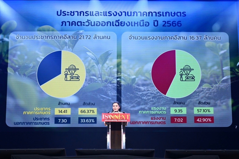 ศ.ดร.นฤมล กล่าวว่า ภาคอีสานเป็นภาคที่มีเนื้อที่ทางการเกษตรมากที่สุดของประเทศ โดยมีเนื้อที่ทางการเกษตร 64.29 ล้านไร่ คิดเป็นสัดส่วนร้อยละ 43.52 ของเนื้อที่ทางการเกษตรทั้งหมดของประเทศ 147.73 ล้านไร่ มีสินค้าเกษตรที่สำคัญ ได้แก่ ข้าว ยางพารา มันสำปะหลัง อ้อยโรงงาน ข้าวโพดเลี้ยงสัตว์ และอื่น ๆ ตามลำดับ มีผลิตภัณฑ์มวลรวมภาค (GDP) มูลค่าประมาณ 1.76 ล้านล้านบาท หรือคิดเป็นร้อยละ 10 ของ GDP ทั้งประเทศ โดยภาคอีสานมีสัดส่วนมูลค่าผลิตภัณฑ์มวลรวมภาคการเกษตรถึงน้อยละ 24 ของ GDP ภาคการเกษตรทั้งประเทศ มีมูลค่าประมาณ 3.63 แสนล้านบาท โดยจังหวัดที่มีมูลค่าการผลิตภาคการเกษตรสูงสุด คือ นครราชสีมา บึงกาฬ อุบลราชธานี อุดรธานี และบุรีรัมย์ ตามลำดับ