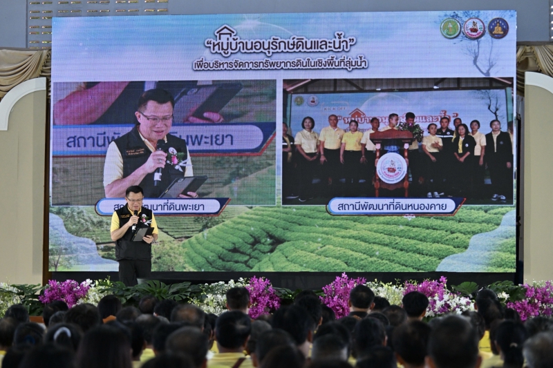ดร.ทวีศักดิ์ ธนเดโชพล อธิบดีกรมพัฒนาที่ดิน เปิดเผยว่า กรมพัฒนาที่ดินดำเนินงานภารกิจด้านการอนุรักษ์ดินและน้ำอย่างต่อเนื่องตลอดระยะเวลากว่า 62 ปี โดยเริ่มศึกษาวิจัยเรื่องดินครอบคลุมในทุกด้าน อาทิ การสำรวจดินและการทำแผนที่การใช้ประโยชน์ที่ดิน การใช้เทคโนโลยีชีวภาพทางดินที่เป็นประโยชน์เพื่อเพิ่มผลผลิตและลดต้นทุนทางการเกษตร รวมถึงช่วยในเรื่องการรักษาสภาพแวดล้อมในภาคเกษตรที่ยั่งยืน การจัดทำแหล่งน้ำเพื่อการอนุรักษ์ดินและน้ำ โดยดำเนินการทั้งวิธีกลและวิธีพืชควบคู่กันไป รวมทั้งสำรวจและจัดทำฐานข้อมูลทั้งทางด้านทรัพยากรธรรมชาติ สภาพเศรษฐกิจและสังคม แล้วนำมาวิเคราะห์วางแผนการใช้ประโยชน์ที่ดิน เพื่อให้เกิดการใช้ประโยชน์ที่ดินได้อย่างถูกต้องและเหมาะสม อีกทั้งกำหนดมาตรการอนุรักษ์ดินและน้ำไปพร้อมกับการทำเกษตรกรรมและด้านอื่น ๆ ซึ่งเกิดการพัฒนาเป็นพื้นที่ดำเนินการของหมู่บ้าน เกิดเป็นต้นแบบ “หมู่บ้านอนุรักษ์ดินและน้ำ” เป็นตัวอย่างในการถ่ายทอดเทคโนโลยีด้านการพัฒนาที่ดินให้ท้องถิ่นได้ต่อยอดและพัฒนาต่อไป