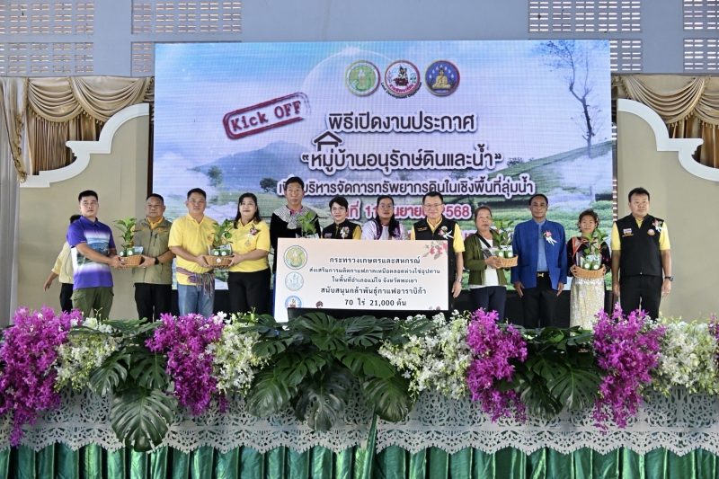 วันพฤหัสบดีที่ 11 กันยายน พ.ศ. 2568 เวลา 10.00 น. กรมพัฒนาที่ดิน จัดพิธีเปิดงานประกาศ “หมู่บ้านอนุรักษ์ดินและน้ำ” ปี 2568 โดยมี ดร.ทวีศักดิ์ ธนเดโชพล อธิบดีกรมพัฒนาที่ดิน เป็นประธาน ดร.สุมิตรา วัฒนา รองอธิบดีกรมพัฒนาที่ดินด้านบริหาร นายเอนก ดีพรมกุล ผู้อำนวยการสำนักงานพัฒนาที่ดินเขต 7 นายบำรุง สังข์ขาว รองผู้ว่าราชการจังหวัดพะเยา ผู้บริหารกรมพัฒนาที่ดิน ผู้อำนวยการสำนักงานพัฒนาที่ดินเขต ผู้อำนวยการสถานีพัฒนาที่ดิน ผู้แทนหน่วยงานราชการ เอกชน หมอดินอาสา เกษตรกร เข้าร่วมกว่า 500 คน ในจัดงานครั้งนี้ได้ดำเนินการพร้อมกัน 12 จังหวัดพื้นที่นำร่อง ให้กับเกษตรกรนำไปสู่การพัฒนาพื้นที่ในรูปแบบ “หมู่บ้านอนุรักษ์ดินและน้ำ” โดยมีศูนย์กลางการจัดงาน ณ บ้านสันหมื่นแก้ว หมู่ 10 ตำบลแม่ปืม อำเภอเมืองพะเยา จังหวัดพะเยา และถ่ายทอดสดไปยังพื้นที่จัดงาน 11 จังหวัด ผ่านระบบ Zoom conference Meeting และ ถ่ายทอดสดผ่านเพจเฟซบุ๊กกรมพัฒนาที่ดินมีผู้เข้าร่วมกว่า 10,000 คน