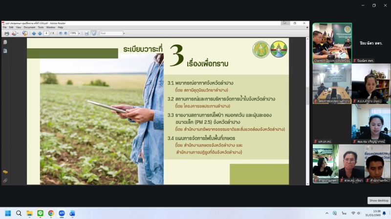 วันอังคารที่ 31 มีนาคม 2569 (เวลา 13.30 น.) ดร.พรเทพ ศรีธนาธร ผู้ตรวจราชการกระทรวงเกษตรและสหกรณ์ เขตตรวจราชการที่ 15 เป็นประธานการประชุมคณะกรรมการศูนย์ติดตามและแก้ไขปัญหาภัยพิบัติด้านการเกษตรจังหวัดลำปาง ครั้งที่ 3/2569 ผ่านระบบออนไลน์ (Zoom Meeting) โดยมี นายจิตติศักดิ์ ศรีปัญญา เกษตรและสหกรณ์จังหวัดลำปาง พร้อมด้วยหัวหน้าส่วนราชการและผู้แทนหน่วยงานที่เกี่ยวข้องเข้าร่วมประชุม ณ ห้องประชุม1402 สำนักตรวจราชการ สำนักงานปลัดกระทรวงเกษตร