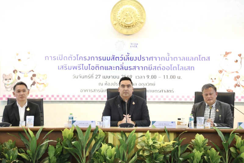 นายวัชระพล ขาวขำ รัฐมนตรีช่วยว่าการกระทรวงเกษตรและสหกรณ์ ให้เกียรติเข้าร่วมงานแถลงข่าวเปิดตัวโครงการโครงการนมสัตว์เลี้ยงปราศจากน้ำตาลแลคโตส เสริมพรีไบโอติก และกลิ่นรสจากยีสต์ออโตไลเสท (KU Lactova Milk) ซึ่งเป็นนวัตกรรมนมสำหรับสัตว์เลี้ยงปราศจากน้ำตาลแลคโตส 100% ผลงานวิจัยและพัฒนาจากศูนย์ผลิตภัณฑ์นม มหาวิทยาลัยเกษตรศาสตร์ โดยมี ดร.ดำรงค์ ศรีพระราม รักษาการแทนอธิการบดี มหาวิทยาลัยเกษตรศาสตร์ เป็นประธาน ณ ห้องประชุมกำพล อดุลวิทย์ อาคารสารนิเทศ 50 ปี มหาวิทยาลัยเกษตรศาสตร์ บางเขน กรุงเทพฯ
