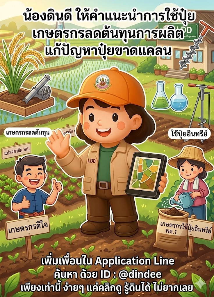 นางสาวสุมิตรา วัฒนา อธิบดีกรมพัฒนาที่ดิน เปิดเผยว่า กรมพัฒนาที่ดิน ขานรับนโยบายผลักดันการใช้ปุ๋ยอินทรีย์ ของรัฐมนตรีว่าการกระทรวงเกษตรและสหกรณ์ (นายสุริยะ จึงรุ่งเรืองกิจ) ที่ให้ความสำคัญกับการดำเนินมาตรการเร่งด่วนรองรับผลกระทบจากสถานการณ์ตะวันออกกลาง โดยกรมฯ ได้ให้บริการข้อมูลในการจัดการดิน อาทิ ข้อมูลเชิงพื้นที่เพื่อตรวจสอบข้อมูลดิน คุณลักษณะของดินที่เหมาะสมกับการเพาะปลูก การวางแผนการใช้ที่ดิน การตรวจวิเคราะห์ดิน และการปรับปรุงบำรุงดิน ที่ได้รับการพัฒนาข้อมูลอย่างต่อเนื่อง ด้วยเทคโนโลยี AI Chatbot “น้องดินดี” ผ่าน Application Line ด้วยระบบโต้ตอบอัตโนมัติ ซึ่งสามารถเข้าถึงข้อมูลการให้บริการต่างๆ ได้อย่างสะดวก รวดเร็ว ตลอด 24 ชั่วโมง ตอบสนองความต้องการแก่เกษตรกรและประชาชนที่ต้องการได้รับข้อมูลการบริการที่รวดเร็ว สอดรับกับสถานการณ์ในปัจจุบัน