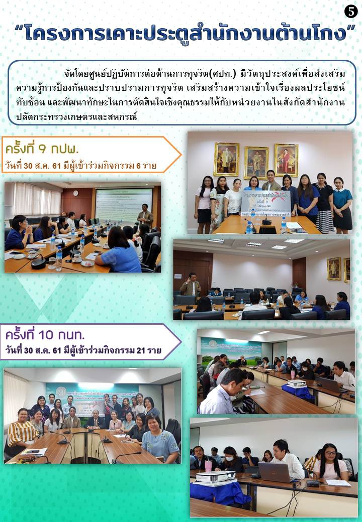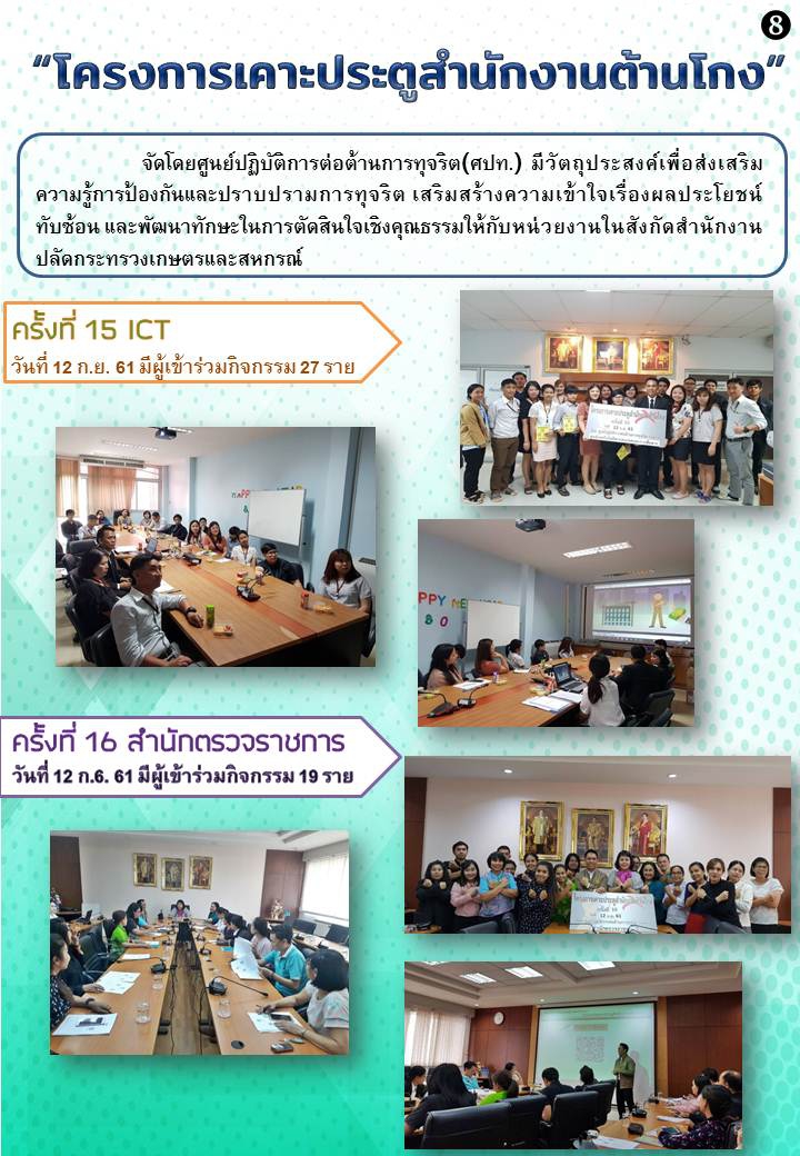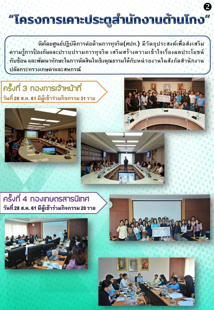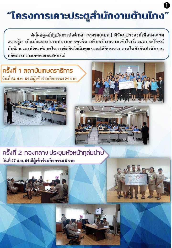 ศูนย์ปฏิบัติการต่อต้านการทุจริต (ศปท.) จะดำเนินการจัด “โครงการเคาะประตูสำนักงานต้านโกง” โดยมีวัตถุประสงค์เพื่อ ส่งเสริมความรู้การป้องกันและปราบปรามการทุจริต เสริมสร้างความเข้าใจเรื่องผลประโยชน์ทับซ้อน และพัฒนาทักษะในการตัดสินใจเชิงคุณธรรม โดยดำเนินการในรูปแบบของการบรรยายให้ความรู้ และการตอบข้อซักถาม ในระยะเวลา 1 ชั่วโมง หรือตามความเหมาะสม ให้กับบุคลากรในแต่ละสำนัก/กอง สังกัดสำนักงานปลัดกระทรวงเกษตรและสหกรณ์ส่วนกลาง ระหว่างเดือนสิงหาคม ถึงกันยายน 2561