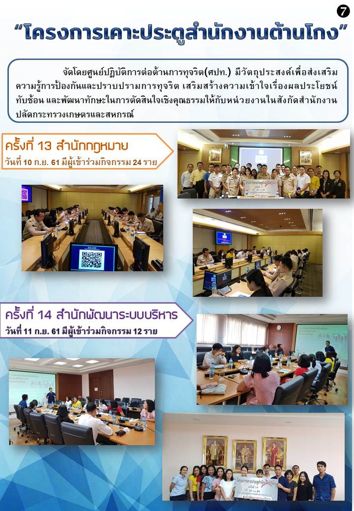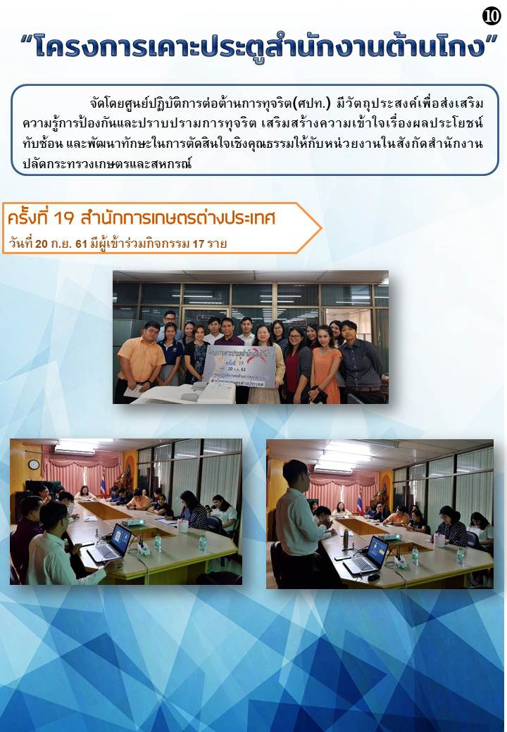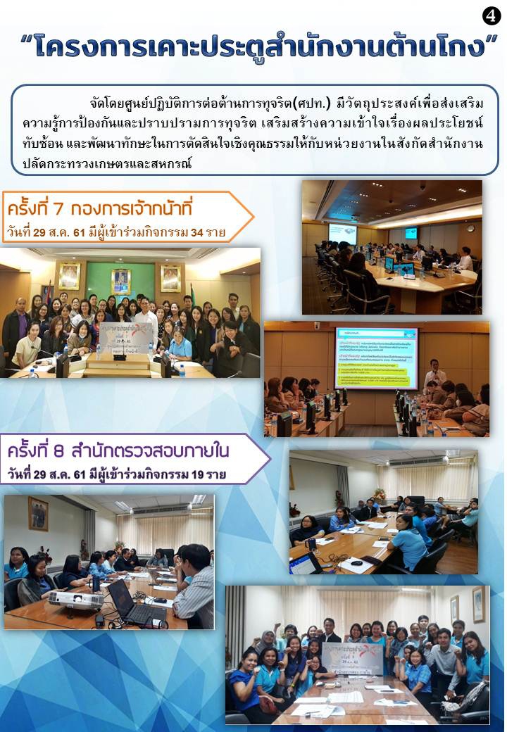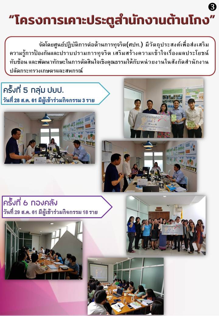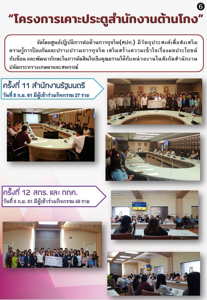 ศูนย์ปฏิบัติการต่อต้านการทุจริต (ศปท.) จะดำเนินการจัด “โครงการเคาะประตูสำนักงานต้านโกง” โดยมีวัตถุประสงค์เพื่อ ส่งเสริมความรู้การป้องกันและปราบปรามการทุจริต เสริมสร้างความเข้าใจเรื่องผลประโยชน์ทับซ้อน และพัฒนาทักษะในการตัดสินใจเชิงคุณธรรม โดยดำเนินการในรูปแบบของการบรรยายให้ความรู้ และการตอบข้อซักถาม ในระยะเวลา 1 ชั่วโมง หรือตามความเหมาะสม ให้กับบุคลากรในแต่ละสำนัก/กอง สังกัดสำนักงานปลัดกระทรวงเกษตรและสหกรณ์ส่วนกลาง ระหว่างเดือนสิงหาคม ถึงกันยายน 2561