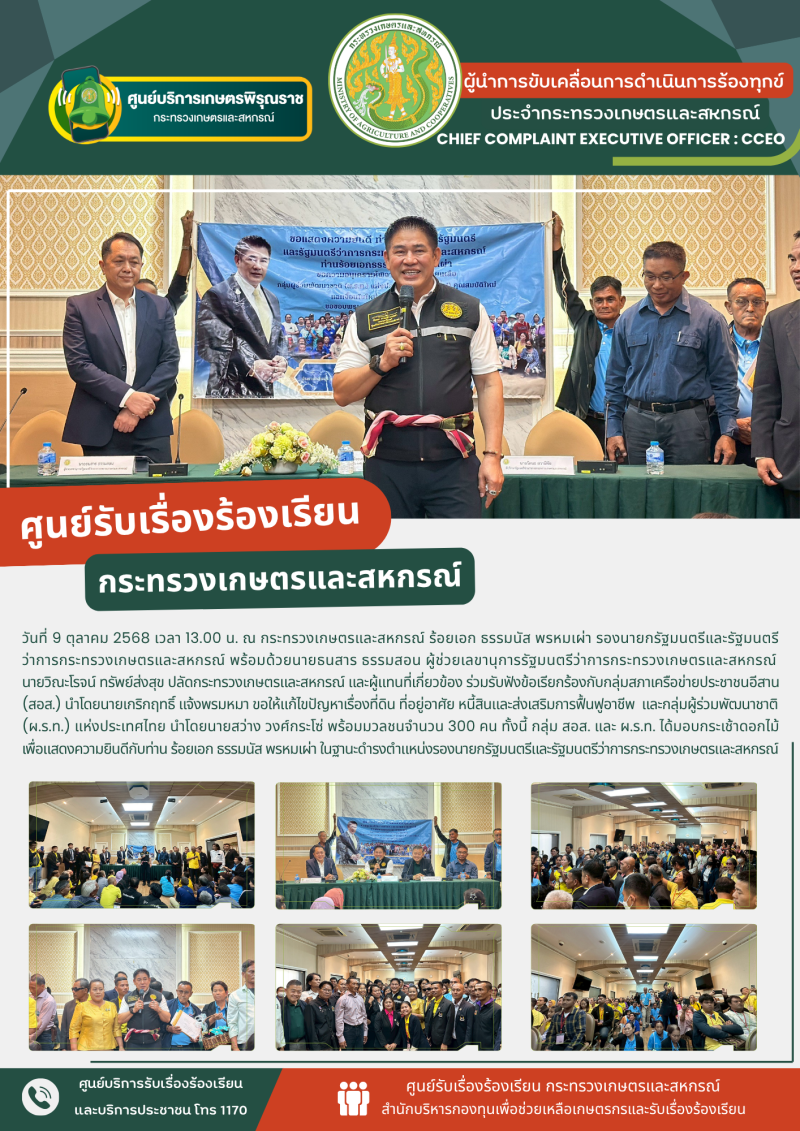 วันที่ 9 ตุลาคม 2568 เวลา 13.00 น. ณ กระทรวงเกษตรและสหกรณ์ ร้อยเอก ธรรมนัส พรหมเผ่า รองนายกรัฐมนตรีและรัฐมนตรีว่าการกระทรวงเกษตรและสหกรณ์