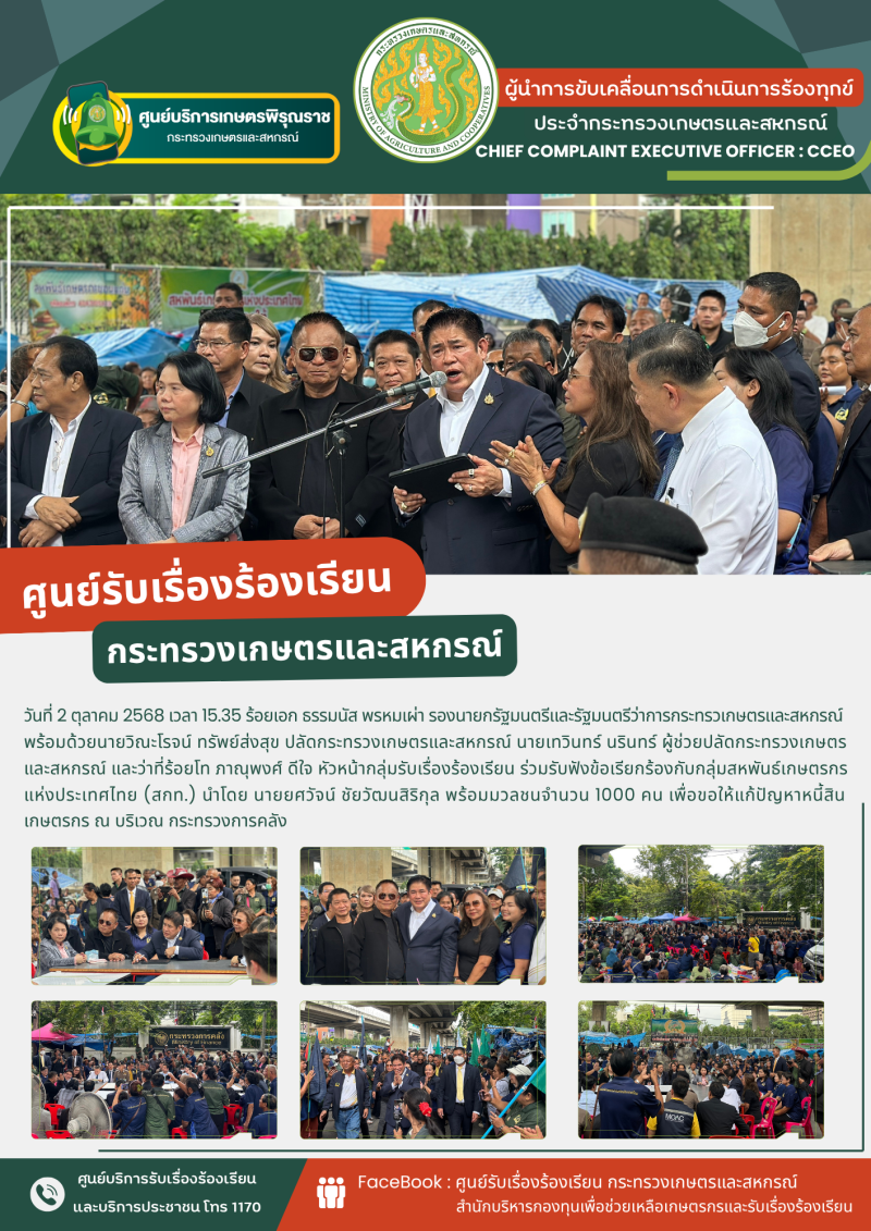 วันที่ 2 ตุลาคม 2568 เวลา 15.35 ร้อยเอก ธรรมนัส พรหมเผ่า รองนายกรัฐมนตรีและรัฐมนตรีว่าการกระทรวเกษตรและสหกรณ์ พร้อมด้วยนายวิณะโรจน์ ทรัพย์ส่งสุข ปลัดกระทรวงเกษตรและสหกรณ์