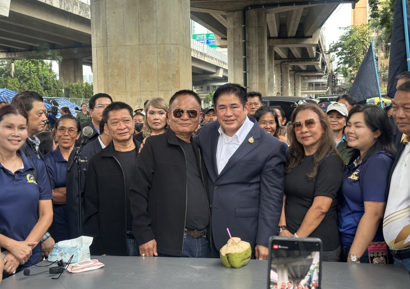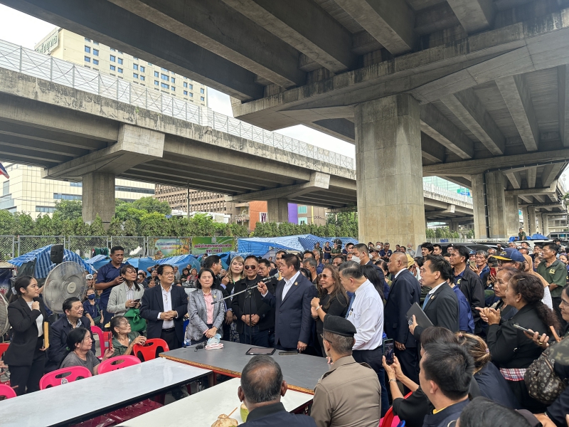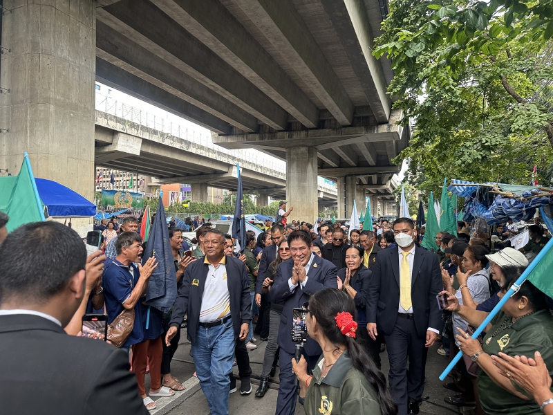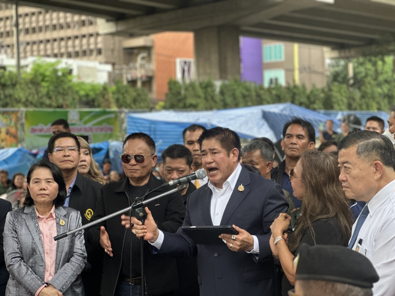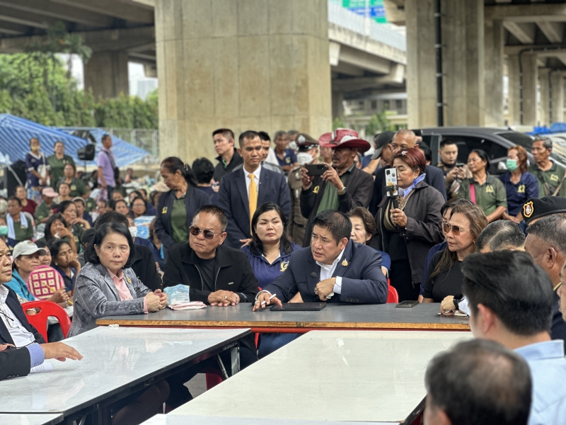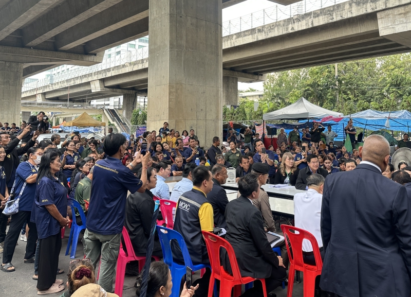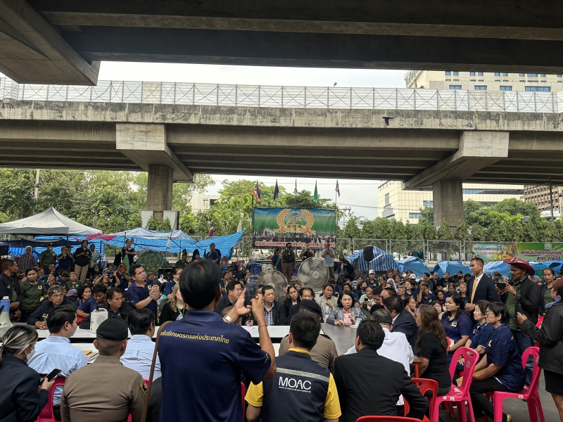 นายเทวินทร์ นรินทร์ ผู้ช่วยปลัดกระทรวงเกษตรและสหกรณ์ และว่าที่ร้อยโท ภาณุพงศ์ ดีใจ หัวหน้ากลุ่มรับเรื่องร้องเรียน ร่วมรับฟังข้อเรียกร้องกับกลุ่มสหพันธ์เกษตรกรแห่งประเทศไทย (สกท.)
