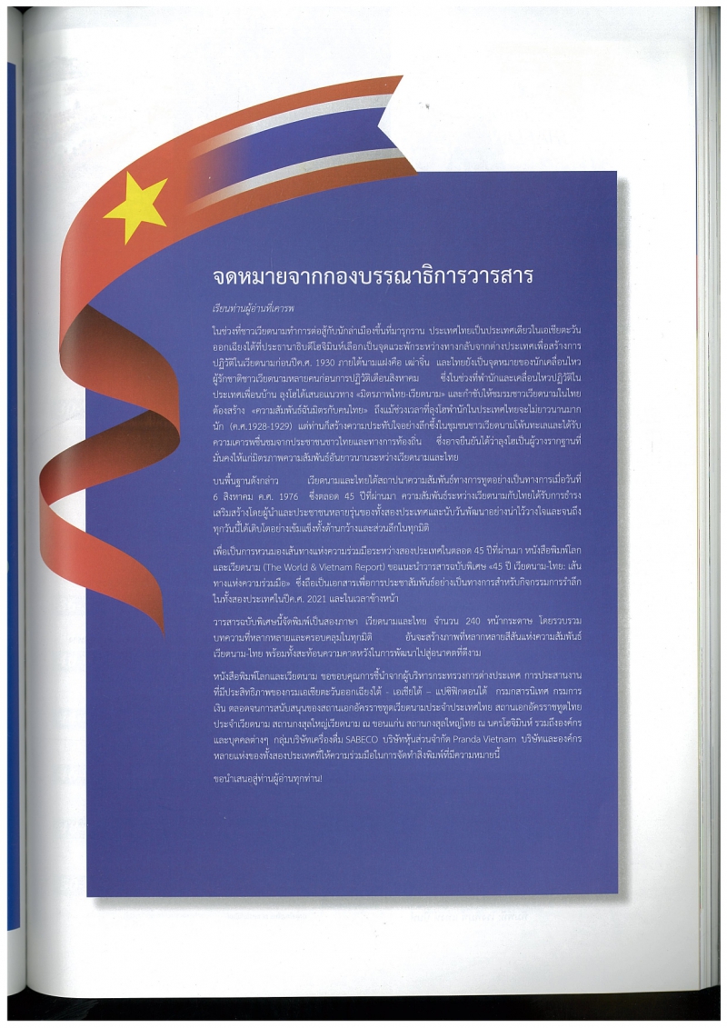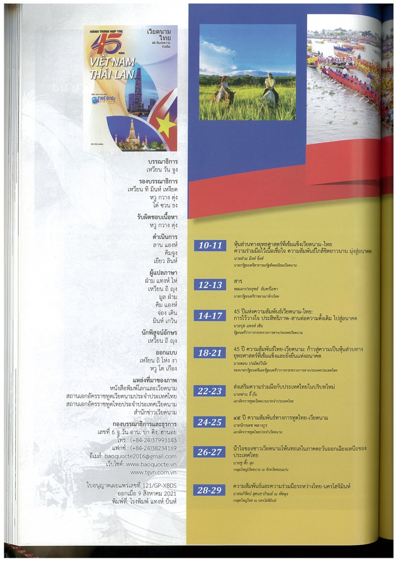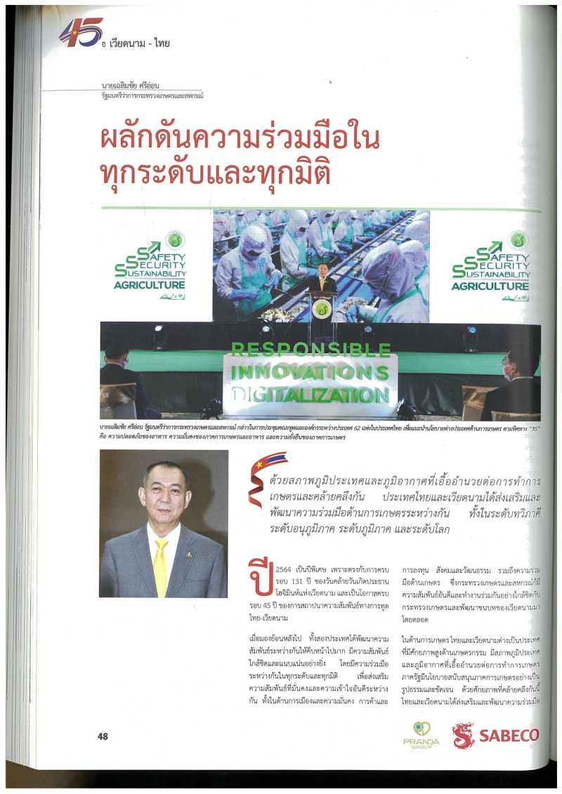 ดร.เฉลิมชัย ศรีอ่อน รัฐมนตรีว่าการกระทรวงเกษตรและสหกรณ์ กล่าวในบทความ “ผลักดันความร่วมมือระหว่างไทย-เวียดนาม ในทุกระดับและทุกมิติ” ในหน้าที่ 46 – 47 ซึ่งตีพิมพ์ลงในวารสาร “The World & Vietnam Report” ใน special edition titled "Forty-five years of Vietnam-Thailand relations (1976-2021)” เพื่อฉลองครบรอบ 45 ปี การสถาปนาความสัมพันธ์ทางการทูตระหว่างไทยและเวียดนาม ซึ่งกระทรวงเกษตรและสหกรณ์ของไทย มีความสัมพันธ์อันดีและทำงานร่วมกันอย่างใกล้ชิดกับกระทรวงเกษตรและพัฒนาชนบทของเวียดนามมาโดยตลอด