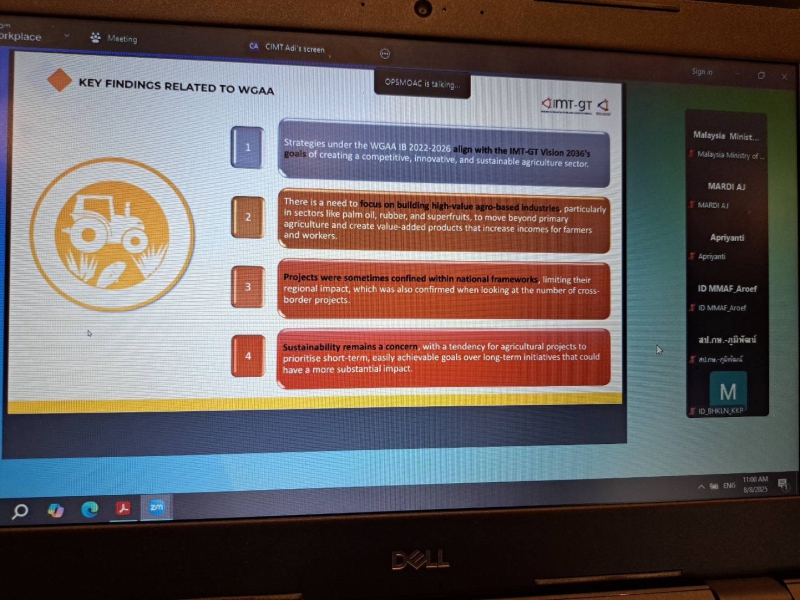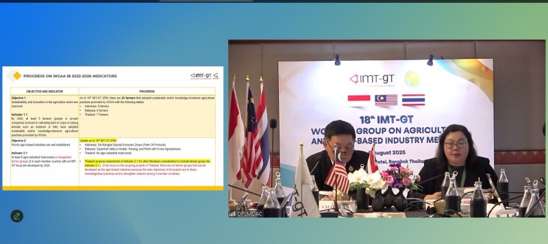 รองปลัดกระทรวงเกษตรและสหกรณ์ กล่าวว่า ประเทศไทยยินดีและพร้อมสนับสนุนโครงการและกิจกรรมภายใต้กรอบความร่วมมือสาขาเกษตรและอุตสาหกรรมเกษตรร่วมกับประเทศสมาชิก IMT - GT โดยการทำงานอย่างใกล้ชิดผ่านการสนับสนุนด้านวิชาการ การพัฒนาขีดความสามารถ ตลอดจนการแลกเปลี่ยนองค์ความรู้และแนวปฏิบัติที่ดี เพื่อเสริมสร้างการผลิตและความยั่งยืนทางเกษตรในอนุภูมิภาค IMT – GT