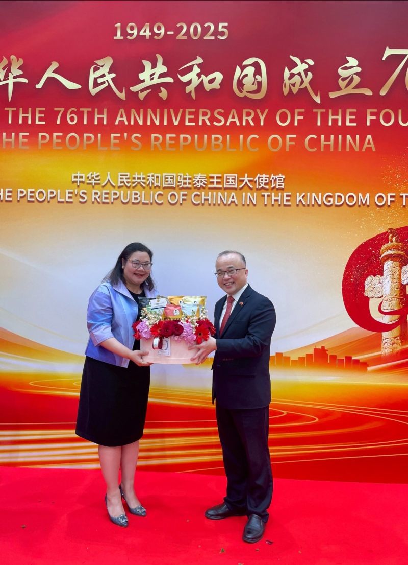 วันที่ 23 กันยายน 2568 เวลา 18.30 น. นางสาวไปรยา เศวตจินดา ผู้อำนวยการสำนักการเกษตรต่างประเทศ เข้าร่วมงานเลี้ยงรับรองเพื่อเฉลิมฉลองเนื่องในโอกาสครบรอบ 76 ปี วันสถาปนาสาธารณรัฐประชาชนจีน ตามคำเชิญของนายจาง เจี้ยนเว่ย (Mr. Zhang Jianwei) เอกอัครราชทูตวิสามัญผู้มีอำนาจเต็มแห่งสาธารณรัฐประชาชนจีนประจำประเทศไทย โดยในโอกาสนี้ผู้อำนวยการสำนักการเกษตรต่างประเทศได้มอบกระเช้าดอกไม้ในนามรองนายกและรัฐมนตรีว่าการกระทรวงเกษตรและสหกรณ์ (ร้อยเอกธรรมนัส พรหมเผ่า) ณ Plenary Hall ศูนย์การประชุมแห่งชาติสิริกิติ์