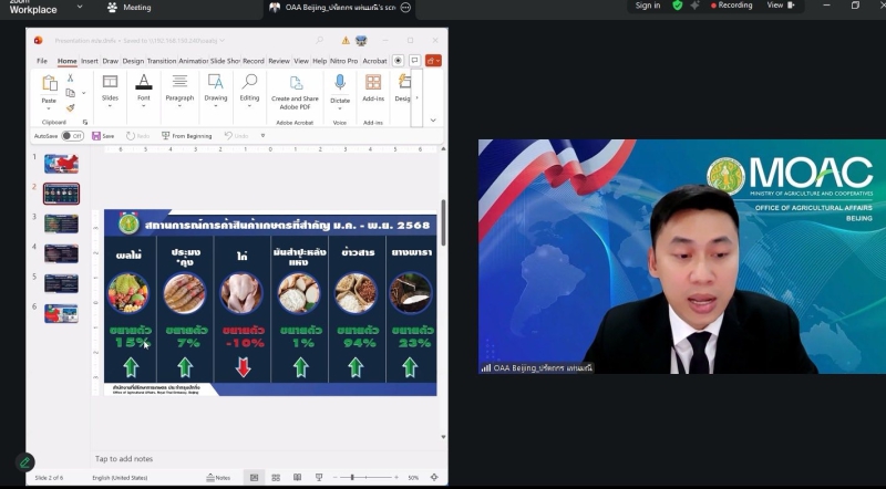 ทูตเกษตรได้รายงานภาพรวมสถานการณ์การค้าสินค้าเกษตรไทยในปี 2568 ซึ่งยังคงเติบโตอย่างต่อเนื่องในตลาดหลัก อาทิ จีน สหภาพยุโรป และสหรัฐอเมริกา แม้สถานการณ์เศรษฐกิจโลกจะเผชิญความท้าทาย แต่สินค้าเกษตรและอาหารของไทยหลายรายการยังคงมีแนวโน้มที่ดี รมว.กษ. จึงเน้นย้ำให้เร่งแก้ไขปัญหาอุปสรรค ควบคู่กับการรักษามาตรฐานสินค้า และการคาดการณ์โอกาสในตลาดใหม่