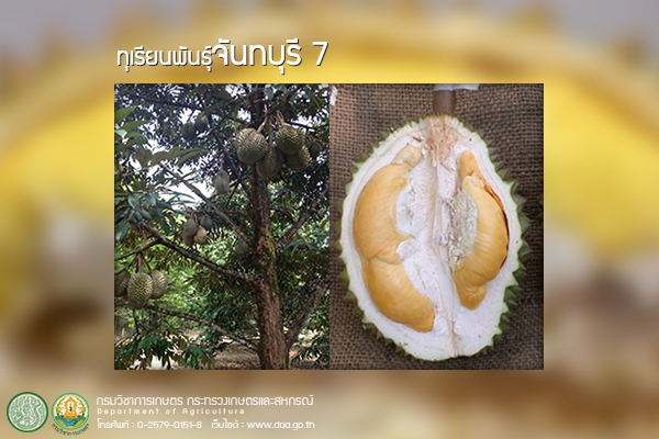 ทุเรียนพันธุ์จันทบุรี 7 มีอายุการเก็บเกี่ยวสั้น โดยมีอายุเก็บเกี่ยวเพียง 95 วัน หลังดอกบาน มีคุณภาพดีเด่นด้านรสชาติและคุณภาพในการรับประทานใกล้เคียงกับพันธุ์มาตรฐานที่เป็นการค้าในปัจจุบัน เช่น ชะนีและหมอนทอง มีเนื้อละเอียด สีเนื้อมีสีเหลืองเข้ม เหนียว รสชาติหวาน มัน อร่อยและกลิ่นอ่อน มีรูปทรงผลกลมรี ก้านผลยาว 5.8 เซนติเมตร ความหนาเปลือก 1.6 เซนติเมตร ความหนาเนื้อ 0.9 เซนติเมตร พื้นที่แนะนำให้ปลูกในภาคตะวันออก เช่น จังหวัดจันทบุรี ตราด และระยอง เป็นต้น