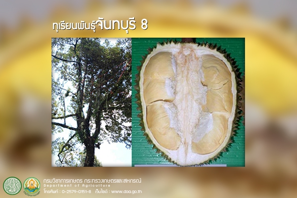 ทุเรียนพันธุ์จันทบุรี 8 มีอายุการเก็บเกี่ยวปานกลาง โดยมีอายุเก็บเกี่ยวเฉลี่ย 114 วันหลังดอกบานมีคุณภาพดีเด่นด้านรสชาติและคุณภาพในการรับประทานใกล้เคียงกับพันธุ์มาตรฐานที่เป็นพันธุ์การค้าในปัจจุบัน เช่น ชะนีและหมอนทอง มีเนื้อละเอียด สีเนื้อมีสีเหลือง เหนียว รสชาติหวาน มันดีมากและมีกลิ่นอ่อน น้ำหนักเฉลี่ย 2.45 กิโลกรัม ความยาวผล 21 เซนติเมตร เส้นผ่านศูนย์กลางผล 16.67 เซนติเมตร ความยาวเส้นรอบวงผล 58.66 เซนติเมตร พื้นที่แนะนำให้ปลูกในเขตปลูกทุเรียนภาคตะวันออก เช่น จังหวัดจันทบรี ตราดและระยอง เป็นต้น