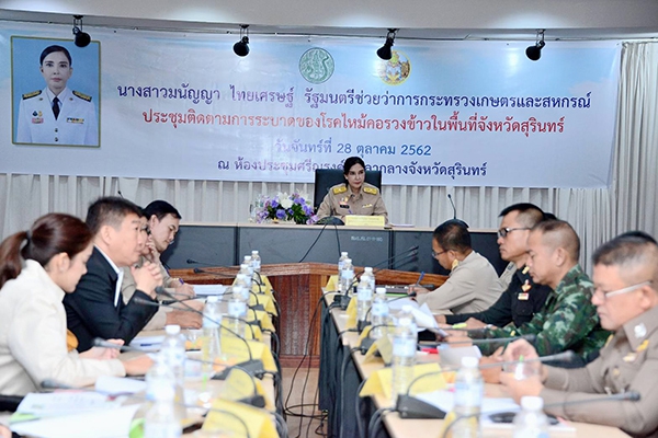 นางสาวมนัญญา ไทยเศรษฐ์ รัฐมนตรีช่วยว่าการกระทรวงเกษตรและสหกรณ์ เปิดเผยภายหลังการประชุมติดตามสถานการณ์การระบาดของโรคไหม้คอรวงข้าวในพื้นที่จังหวัดสุรินทร์ ณ ศาลากลางจังหวัดสุรินทร์ อ.เมือง จ.สุรินทร์ ว่า จากการรายงานสถานการณ์การระบาดศัตรูข้าวของกรมส่งเสริมการเกษตร เมื่อวันที่ 16 ตุลาคม 2562 ที่ผ่านมา พบการระบาดของโรคไหม้คอรวงข้าวใน 7 จังหวัด ได้แก่ ลําพูน แพร่ จันทบุรี มุกดาหาร มหาสารคาม สุรินทร์ และสงขลา รวม 7,442 ไร่ และพบการระบาดของเพลี้ยกระโดดสีน้ำตาลใน 6 จังหวัด ได้แก่ ลําปาง แพร่ อุตรดิตถ์ พิจิตร อ่างทอง และสุพรรณบุรี รวม 18,141 ไร่ นอกจากนี้ กรมการข้าวยังได้รับรายงานการระบาดของโรคไหม้ในพื้นที่จังหวัดสุรินทร์ จํานวน 77,777 ไร่ และการระบาดของเพลี้ยกระโดดสีน้ำตาลในพื้นที่จังหวัดลําปางด้วยเช่นกัน กระทรวงเกษตรแชะสหกรณ์ โดยกรมการข้าวจึงมีการแจ้งเตือนภัยการระบาดของศัตรูข้าวทั้ง 2 ชนิด ในพื้นที่ภาคเหนือ ภาคตะวันออกเฉียงเหนือ ภาคกลาง ภาคตะวันออกและภาคตะวันตก