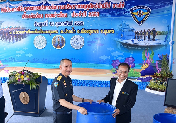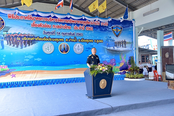 นายเฉลิมชัย ศรีอ่อน รัฐมนตรีว่าการกระทรวงเกษตรและสหกรณ์ เปิดเผยภายหลังพิธีประกาศใช้มาตรการบริหารจัดการทรัพยากรสัตว์น้ำมีไข่ วางไข่ เลี้ยงตัวอ่อน ทะเลอ่าวไทย ประจำปี 2563 ณ ท่าเทียบเรือองค์การสะพานปลาปากน้ำชุมพร ต.ปากน้ำ อ.เมือง จ.ชุมพร ว่า จากผลการศึกษาวิจัยทางวิชาการของกรมประมงพบว่าพื้นที่ทะเลของจังหวัดประจวบคีรีขันธ์ ชุมพร และสุราษฎร์ธานี เป็นพื้นที่ที่สัตว์น้ำเศรษฐกิจหลายชนิด โดยเฉพาะปลาทู ซึ่งมีวงจรชีวิตในช่วงของการปิดอ่าวไทยตอนกลาง กระทรวงเกษตรและสหกรณ์ โดยกรมประมง ซึ่งมีหน้าที่ดูแลการใช้ประโยชน์จากทรัพยากรสัตว์น้ำ จำเป็นต้องดำเนินมาตรการบริหารจัดการทรัพยากรสัตว์น้ำ เพื่อป้องกันการใช้ทรัพยากรเกินกำลังการผลิตของธรรมชาติ และไม่ให้เกิดความเสื่อมโทรมของทรัพยากรสัตว์น้ำ จึงได้กำหนดมาตรการทางกฎหมายขึ้น