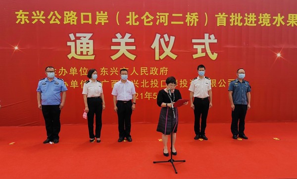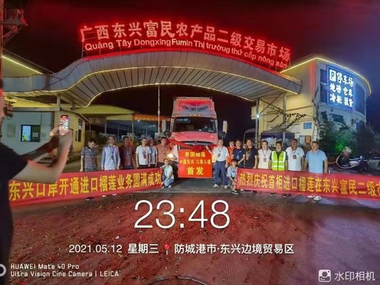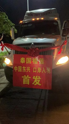 โดยนายปรัตถกร แท่นมณี กงสุล (ฝ่ายเกษตร) ประจำสถานกงสุลใหญ่ ณ นครกว่างโจวรายงานว่า เมื่อช่วงเช้าวันที่ 11 พฤษภาคม 2564 ได้ประเดิมส่งออกทุเรียนตู้ปฐมฤกษ์เพื่อทดลองนำร่องในการขนส่งผ่านด่านตงซิง จำนวน 2 ตู้คอนแทนเนอร์ ปริมาณรวม 36 ตัน มูลค่ากว่า 4 ล้านบาท ซึ่งพบว่ารถขนส่งสามารถผ่านเข้าด่านตงซิงและผ่านพิธีการศุลกากรได้อย่างราบรื่น โดยผู้ประกอบการจีนได้ทำการต้อนรับตู้ทุเรียนตู้แรกของไทย ณ ตลาดการค้าสินค้าเกษตรฟู่หมินตงซิงกว่างซี เมื่อเวลา 23.48 น. ตามเวลาท้องถิ่น ของวันที่ 12 พฤษภาคม 2564 ซึ่งเป็นผลจากการที่สำนักงานศุลกากรแห่งชาติจีน (GACC) ได้ประกาศให้ด่านตงซิง (สะพานข้ามแม่น้ำเป่ยหลุนแห่งที่ 2) สามารถนำเข้าผลไม้จากต่างประเทศได้ ตั้งแต่วันที่ 29 เมษายน 2564 ซึ่งเป็นผลมาจากหน่วยงานที่เกี่ยวข้อง ได้แก่ กรมวิชาการเกษตร สำนักงานมาตรฐานสินค้าเกษตรและอาหารแห่งชาติ และฝ่ายเกษตรฯ กว่างโจว โดย ดร. เฉลิมชัย ศรีอ่อน รัฐมนตรีว่าการกระทรวงเกษตรและสหกรณ์ ได้การเจรจาและผลักดันการทำความตกลงกับสำนักงานศุลกากรแห่งชาติจีน (GACC) จนเห็นชอบร่วมกันให้บรรจุด่านตงซิงเข้าไปในร่างพิธีสารว่าด้วยข้อกำหนดในการกักกันโรคและตรวจสอบสำหรับการขนส่งผลไม้ไทยที่ส่งออกผ่านประเทศที่สามเข้าสู่สาธารณรัฐประชาชนจีน