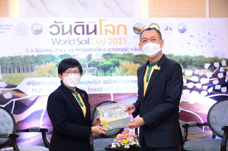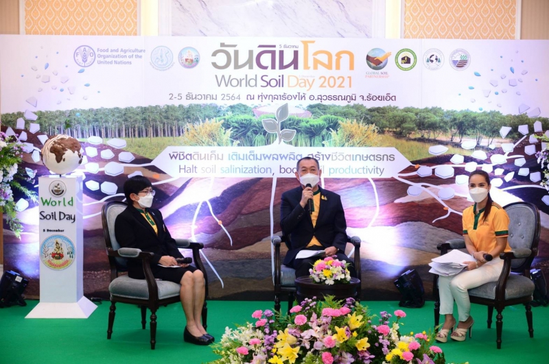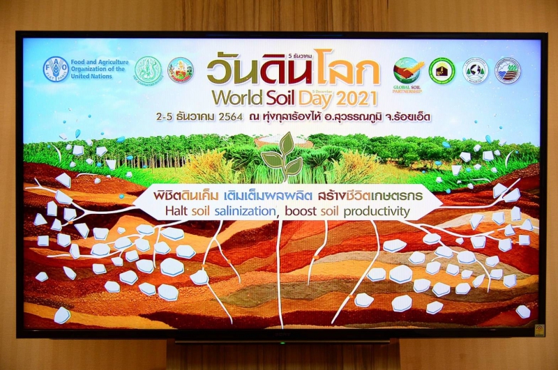 รัฐมนตรีว่าการกระทรวงเกษตรและสหกรณ์ กล่าวว่า จากการที่สหภาพวิทยาศาสตร์ทางดินนานาชาติ (International Union of Soil Sciences–IUSS) ได้ทูลเกล้าฯ ถวายรางวัล ประกาศนียบัตร และประกาศสดุดีพระเกียรติคุณ “นักวิทยาศาสตร์ดิน เพื่อมนุษยธรรม” (The Humanitarian Soil Scientist) แด่พระบาทสมเด็จพระบรมชนกาธิเบศร มหาภูมิพลอดุลยเดชมหาราช บรมนาถบพิตร และต่อมาองค์การสหประชาชาติได้ประกาศพระเกียรติคุณ โดยให้การรับรองให้วันที่ 5 ธันวาคม ซึ่งเป็นวันคล้ายวันพระราชสมภพเป็นวันดินโลก (World Soil Day) โดยในปีนี้กรมพัฒนาที่ดิน ร่วมกับสมาคมดินและปุ๋ยแห่งประเทศไทย สมาคมอนุรักษ์ดินและน้ำ สมาคมดินโลก และองค์การอาหารและเกษตรแห่งสหประชาชาติ (FAO) ได้กำหนดจัดงานวันดินโลก 2564 ในหัวข้อ “Halt soil salinization, boost soil productivity : พิชิตดินเค็ม เติมเต็มผลผลิต สร้างชีวิตเกษตรกร” โดยมีเป้าหมายหลักที่ต้องการผลักดันให้เกิดข้อสรุปหรือผลกระทบเพื่อตอบสนองต่อสถานการณ์สิ่งแวดล้อมของโลก เนื่องจากในปัจจุบันทั่วโลกมีพื้นที่มากกว่า 5.2 ล้านไร่ ที่ประสบปัญหาดินเค็ม จึงมีความจำเป็นต้องจัดการกับความเค็มของดิน โดยการสร้างความตระหนักรู้เกี่ยวกับดินและการจัดการดินเค็มอย่างครบวงจร เพื่อส่งเสริมให้รัฐบาล องค์กร ชุมชน และประชากรโลก มุ่งมั่นที่จะปรับปรุงดินเค็มในเชิงรุก เพื่อเพิ่มพื้นที่ในการเพาะปลูกพืชและสร้างแหล่งผลิตอาหารให้มากยิ่งขึ้น โดยมุ่งเน้นความสำคัญของการร่วมมือกันป้องกันและแก้ไขปัญหาของดิน ซึ่งจะส่งผลถึงความมั่นคงและความปลอดภัยทางด้านอาหาร เพื่อตอบสนองต่อเป้าหมายการพัฒนาที่ยั่งยืน