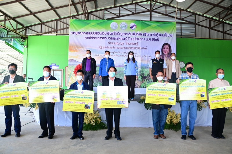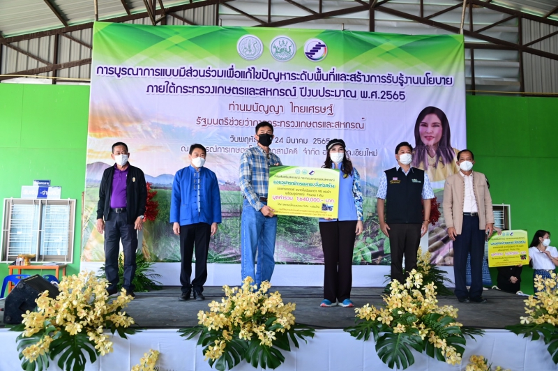 โอกาสนี้ รมช.เกษตรฯ ได้มอบอุปกรณ์การตลาด สิ่งก่อสร้าง อาทิ รถแทรกเตอร์พร้อมอุปกรณ์ เครื่องอบลดความชื้นพร้อมโรงคลุม เครื่องชั่งรถบรรทุกพร้อมอุปกรณ์และห้องควบคุม รถตักล้อยาง รถยกพาเลท โกดัง และลานตากคอนกรีตเสริมเหล็ก ภายใต้โครงการปรับโครงสร้างการผลิต การรวบรวม การแปรรูป ของสถาบันเกษตรกร รองรับผลผลิตทางการเกษตร ปีงบประมาณ 2564 ให้แก่สถาบันเกษตรกร 8 แห่ง ได้แก่ ชุมนุมสหกรณ์การเกษตรภาคเหนือ จำกัด สหกรณ์โคนมแม่ออน จำกัด สหกรณ์โคนมสันกำแพง (ป่าตึงห้วยหม้อ) จำกัด สหกรณ์การเกษตรแม่แจ่ม จำกัด สหกรณ์การเกษตรโหล่งขอดสามัคคี จำกัด สหกรณ์การเกษตรดอยสะเก็ด จำกัด สหกรณ์การเกษตรฝาง จำกัด และสหกรณ์การเกษตรสันป่าตอง จำกัด รวมมูลค่า 65,602,783 บาท ซึ่งอุปกรณ์ต่าง ๆ ที่ได้มอบในวันนี้เป็นสิ่งที่สำคัญ เพราะเป็นเครื่องมือพื้นฐาน นำมาใช้รวบรวมผลผลิตการเกษตรไปปรับปรุงศักยภาพของตนเอง เพื่อพัฒนาสหกรณ์ให้เข้มแข็งและมีศักยภาพในการทำธุรกิจเพิ่มขึ้น เป็นการให้เบ็ดกับสหกรณ์