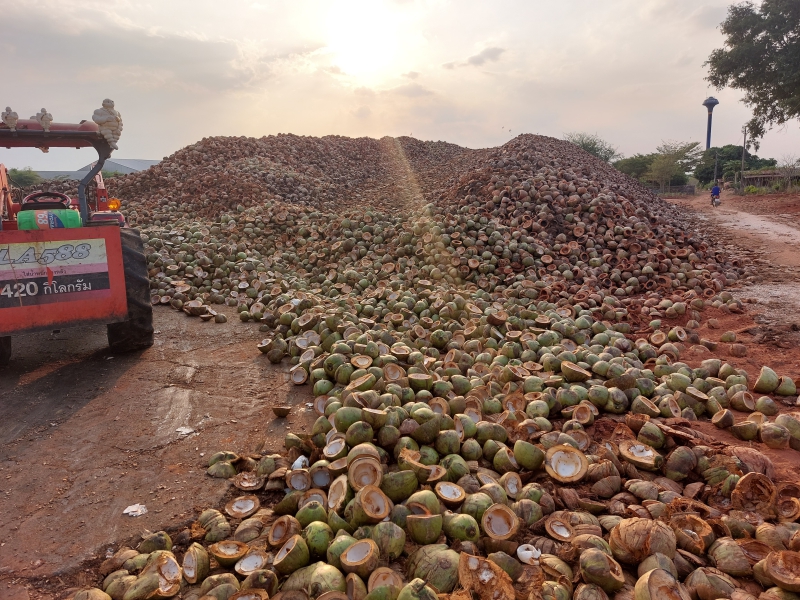 นายฉันทานนท์ วรรณเขจร เลขาธิการสำนักงานเศรษฐกิจการเกษตร (สศก.) เปิดเผยว่า จากที่กระทรวงเกษตรและสหกรณ์ ได้ร่วมขับเคลื่อนภาคเกษตรด้วยโมเดลเศรษฐกิจ BCG Model (Bio-Circular-Green Economy) หรือการขับเคลื่อนการพัฒนาเศรษฐกิจชีวภาพ เศรษฐกิจหมุนเวียน เศรษฐกิจสีเขียว สศก. ได้ทำการวิเคราะห์เชิงเศรษฐกิจของการนำวัสดุเหลือใช้จากมะพร้าวอ่อนมาใช้ในอุตสาหกรรมต่อเนื่องและพลังงานทางเลือก เพื่อศึกษาแนวทางในการส่งเสริมการบริหารจัดการวัสดุเหลือใช้จากมะพร้าวอ่อนตามแนวทางของ BCG Model รวมทั้งเก็บข้อมูลจากเกษตรกร โรงคัดบรรจุ ผู้รวบรวมเปลือกมะพร้าวอ่อน โรงไฟฟ้าชีวมวล กลุ่มทำปุ๋ย และกลุ่มทำถ่าน ซึ่งพบว่า เกษตรกรมีการนำสิ่งเหลือใช้จากมะพร้าวอ่อนมาใช้ประโยชน์ในด้านต่าง ๆ โดยนำสิ่งเหลือใช้ในสวนมะพร้าว เช่น ทางมะพร้าว ไปคลุมโคนต้นมะพร้าวอ่อนเพื่อเป็นปุ๋ย หรือนำไปหมักในท้องร่องเพื่อนำไปทำปุ๋ยใส่ต้นมะพร้าวในสวน สามารถช่วยลดค่าปุ๋ยได้ ขณะที่บริษัท/โรงคัดบรรจุมะพร้าว จะมีสิ่งเหลือใช้ เช่น เปลือก จั่น และทะลายมะพร้าว เป็นต้น ที่เหลือทิ้งและเอาไปถมที่บางส่วนมีผู้รวบรวมเปลือกมะพร้าวเพื่อนำไปแปรรูปเป็นใยมะพร้าวก่อนนำไปเป็น ชีวมวลของโรงไฟฟ้า หรือนำไปผลิตเพื่อได้ขุยมะพร้าวสำหรับผสมดินขาย และบางกลุ่มนำไปเผาเพื่อทำถ่านอัดแท่งขาย และได้น้ำส้มควันไม้ซึ่งเป็นผลพลอยได้จากการเผาถ่าน