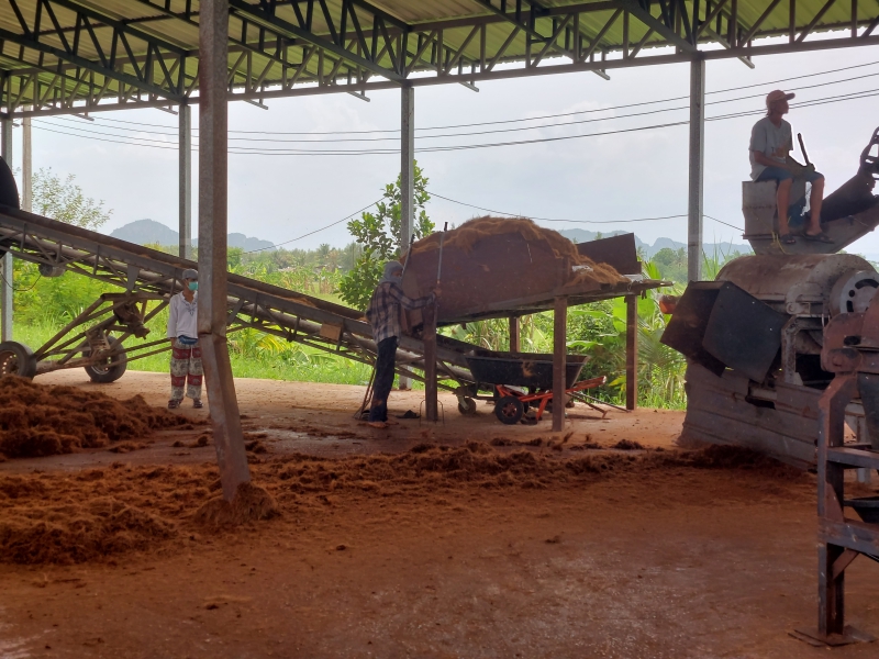 ขุย/ใยมะพร้าว ผู้รวบรวมเปลือกมะพร้าวจะนำเปลือกมะพร้าวจากจุดที่โรงคัดบรรจุนำมาทิ้งมายังโรงงาน เพื่อมาพักและตากเปลือกมะพร้าว ลดความชื้นก่อนเข้าเครื่องจักรโม่เปลือกออกมาเป็นขุยเพื่อส่งขายไปผสมดินและวัสดุปลูกและใยมะพร้าวส่งขายโรงไฟฟ้าชีวมวล โดยมีต้นทุนการแปรรูปขุยมะพร้าวตันละ 700 และใยมะพร้าว ตันละ 350 บาท ราคาขายขุยมะพร้าวไปผสมดินตันละ 1,000 บาท ราคาขายใยมะพร้าวไปโรงไฟฟ้าชีวมวลตันละ 500 บาท คิดเป็นผลตอบแทนสุทธิขายใยมะพร้าวส่งโรงไฟฟ้าตันละ 150 และขายขุยมะพร้าวไปผสมดิน 300 บาท