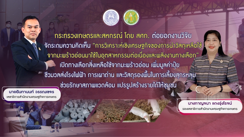 นอกจากนี้ ในการศึกษาวิเคราะห์เชิงเศรษฐกิจของการนำวัสดุเหลือใช้จากมะพร้าวอ่อนมาใช้ในอุตสาหกรรมต่อเนื่องและพลังงานทางเลือกนั้น สศก. โดยสำนักวิจัยเศรษฐกิจการเกษตร ได้มีการการจัดสัมมนาระดมความคิดเห็น (Focus Group) รับฟังข้อคิดเห็นและข้อเสนอแนะจากผู้ที่มีส่วนเกี่ยวข้องในการเพิ่มมูลค่าสิ่งเหลือใช้จากมะพร้าวอ่อน เมื่อต้นเดือนสิงหาคมที่ผ่านมา โดยได้มีการอภิปรายผลงานวิจัย และมุมมองจากคณะวิทยากรภาคส่วนต่างๆ ได้แก่ บริษัท อะโรแมติกฟาร์ม จำกัด บริษัท เอ็นซี โคโคนัท จำกัด ผู้แทนจากโครงการ ReCAP ,GIZ Thailand มหาวิทยาลัยเทคโนโลยีพระจอมเกล้าธนบุรี (ราชบุรี) และมหาวิทยาลัยมหิดล ซึ่งนับว่าเป็นการแลกเปลี่ยนข้อมูลและมุมมองในการส่งเสริมและสนับสนุนงานวิจัยและพัฒนา (R&D) เพื่อเพิ่มมูลค่าของสิ่งเหลือใช้จากมะพร้าวอ่อนให้เป็นรูปธรรมและเชื่อมโยงเครือข่ายผู้มีส่วนเกี่ยวข้องกับ BCG ในการเพิ่มมูลค่าจากสิ่งเหลือใช้จากมะพร้าวอ่อนร่วมกัน