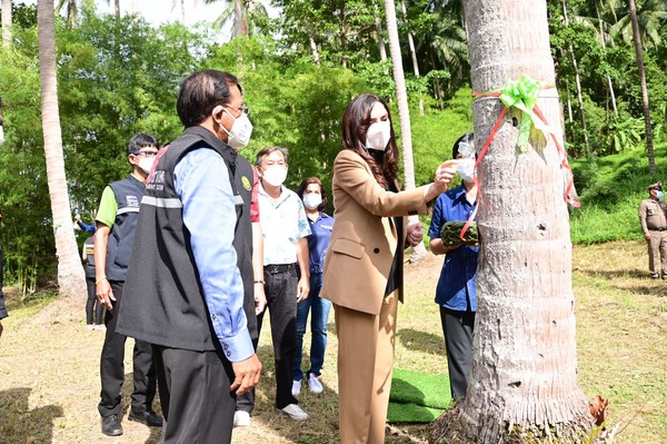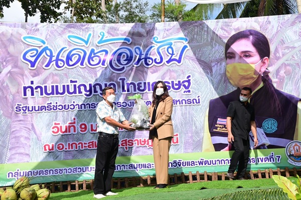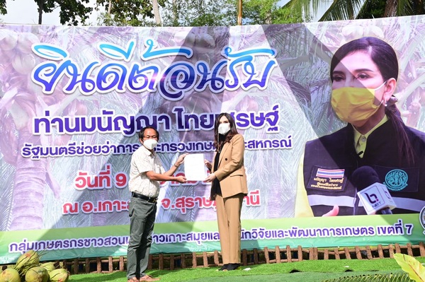 รมช.มนัญญา ไทยเศรษฐ์ รัฐมนตรีช่วยว่าการกระทรวงเกษตรและสหกรณ์ กล่าวภายหลังลงพื้นที่ตรวจเยี่ยมการดำเนินงานมะพร้าวแปลงใหญ่ พร้อมด้วย นายระพีภัทร์ จันทรศรีวงศ์ รองปลัดกระทรวงเกษตรและสหกรณ์ และผู้บริหารหน่วยงานในสังกัดกระทรวงเกษตรและสหกรณ์ ณ ศูนย์เรียนรู้การเพิ่มประสิทธิภาพการผลิตมะพร้าว หมู่ที่ 2 ตำบลหน้าเมือง อ.เกาะสมุย จ.สุราษฎร์ธานี ว่า จังหวัดสุราษฎร์ธานีมีเนื้อที่ใช้ประโยชน์ทางการเกษตร 5,018,161.08 ไร่ คิดเป็น 62.13 ของพื้นที่จังหวัด มีพืชเศรษฐกิจที่สำคัญ คือ ปาล์มน้ำมัน จำนวน 1,365,586 ไร่ มะพร้าว จำนวน 81,550 ไร่ ทุเรียน จำนวน 81,550 ไร่ โดยอำเภอเกาะสมุยเป็นพื้นที่ที่ใช้เพื่อการเกษตรมากที่สุด ส่วนใหญ่เป็นพื้นที่ทำสวนมะพร้าวประมาณ 28,245 ไร่ จำนวน 1,883 ครัวเรือน ซึ่งที่ผ่านมาเกษตรกรทำสวนมะพร้าวประสบปัญหาการระบาดของศัตรูมะพร้าวในพื้นที่มาอย่างต่อเนื่อง และในปี 2555 กรมวิชาการเกษตรได้รับงบประมาณจากกองทุนวิจัย จึงได้เริ่มเข้ามาสำรวจพื้นที่ระบาดของแมลงดำหนาม และจัดทำแผนที่การระบาด ต่อมาได้ดำเนินการเลี้ยงและปล่อยแตน แมลงดำหนาม พร้อมทั้งถ่ายทอดเทคโนโลยีให้กับเกษตรกรในพื้นที่เกาะสมุย ปัจจุบันในพื้นที่สามารถดำเนินการเลี้ยงแตนเบียนได้เอง นอกจากนี้ยังมีการจัดตั้งศูนย์จัดการศัตรูพืชชุมชน รวมทั้งจัดตั้งศูนย์เรียนรู้การเพิ่มประสิทธิภาพการผลิตมะพร้าวอำเภอเกาะสมุยขึ้น ซึ่งการจากดำเนินงานร่วมกันของหน่วยงานในสังกัดกระทรวงเกษตรและสหกรณ์ ในการป้องกันกำจัดศัตรูมะพร้าว โดยใช้เทคโนโลยีของกรมวิชาการเกษตร ส่งผลให้การระบาดของแมลงดำหนาม หนอนหัวดำ ด้วงแรด และด้วงงวงลดน้อยลง ก่อให้เกิดประโยชน์แก่เกษตรกรผู้ปลูกมะพร้าวในพื้นที่ดังกล่าว