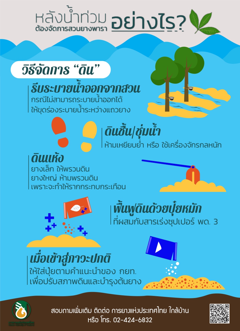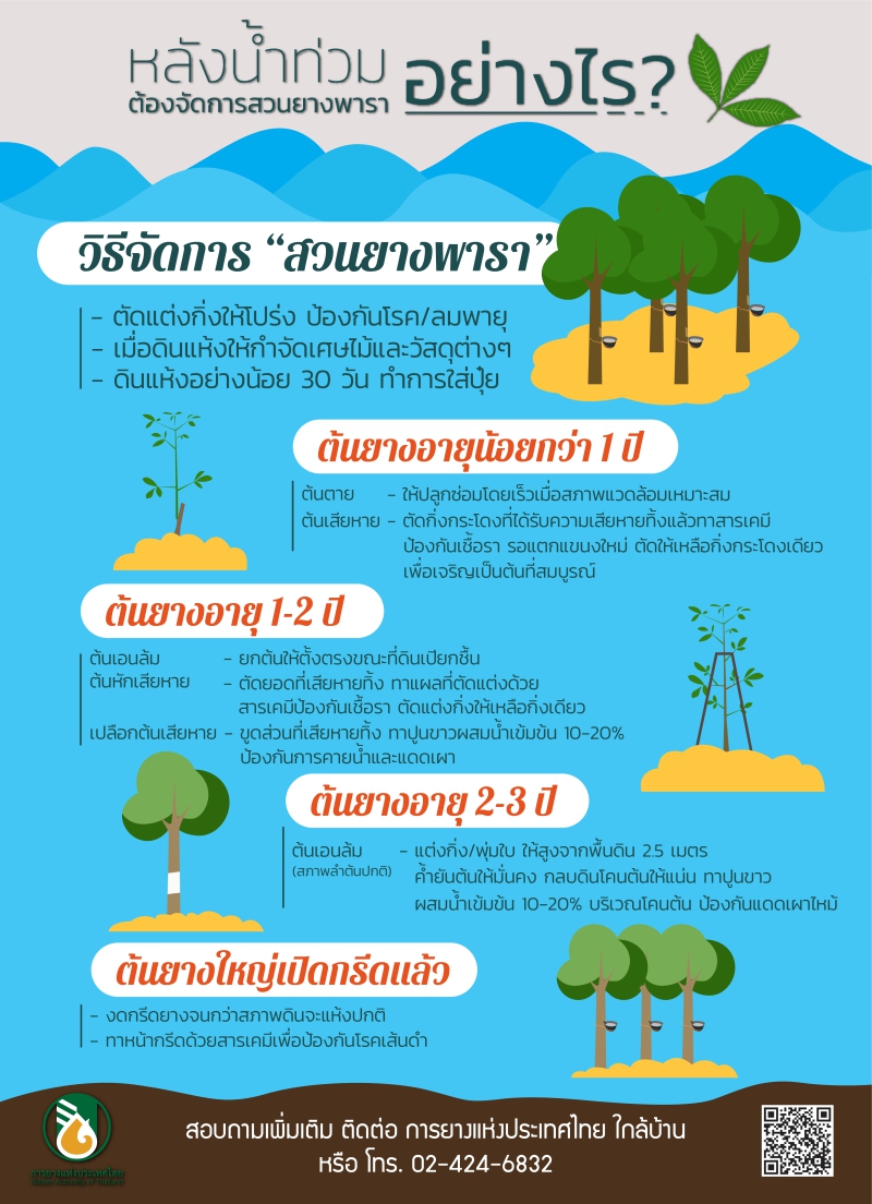 นายณกรณ์ กล่าวเพิ่มเติมว่า ยางพาราถือเป็นพืชที่ค่อนข้างได้เปรียบ เนื่องจากสามารถทนต่อน้ำท่วมขังได้พอสมควร ประมาณ 2 สัปดาห์ถึง 2 เดือน ขึ้นอยู่กับอายุของต้นยาง ระดับน้ำและความยาวนานของน้ำที่ท่วมขัง ดังนั้นการฟื้นฟูสวนยางให้ดีขึ้นหลังจากน้ำลดจึงเป็นวิธีที่ดีที่สุดกยท. แนะนำเกษตรกรสำรวจความเสียหายสภาพสวนยาง เพื่อหาแนวทางในการฟื้นฟูและจัดการสวนยางหลังจากถูกน้ำท่วม โดยกำชับให้ กยท. ในพื้นที่ประชาสัมพันธ์เชิงรุก ให้ความรู้แก่เกษตรกรในการดูแลสวนยางหลังน้ำท่วมอย่างถูกวิธีผ่านสื่อประชาสัมพันธ์ต่างๆ ทุกช่องทาง ผู้ว่าการ กล่าวทิ้งท้าย