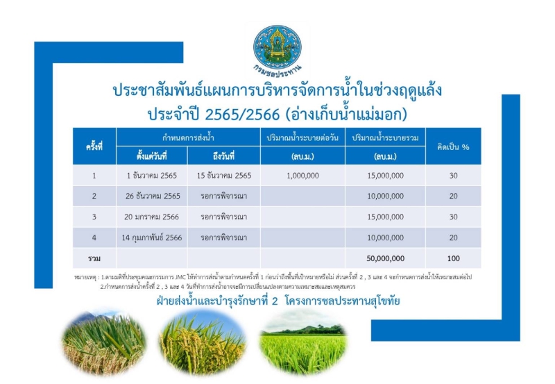 วันอาทิตย์ที่ 4 ธันวาคม พ.ศ. 2565 เวลา 13.30 น. นายเศรษฐเกียรติ กระจ่างวงษ์ รองปลัดกระทรวงเกษตรและสหกรณ์ ได้ลงพื้นที่ตรวจติดตามสถานการณ์น้ำอ่างเก็บน้ำแม่มอก โดยมีนายวีระพันธ์ ปาต๊ะวงค์ นายช่างชลประทาน โครงการอ่างเก็บน้ำแม่มอก และคณะ ให้การต้อนรับ