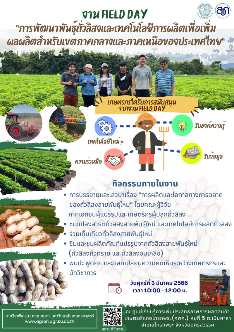 สำหรับกิจกรรมภายในงาน จะมีการบรรยายและเสวนาเรื่อง “การผลิตและโอกาสทางการตลาดของถั่วลิสง สายพันธุ์ใหม่” โดยคณะผู้วิจัย ภาคเอกชนผู้แปรรูป และเกษตรกรผู้ปลูกถั่วลิสง ชมนิทรรศการเทคโนโลยีการผลิตถั่วลิสงพันธุ์ใหม่ “KU-สวก.20” ชมแปลงสาธิตการปลูกและการเก็บเกี่ยวถั่วลิสงสายพันธุ์ใหม่ ชิมและชมผลิตภัณฑ์แปรรูปจากถั่วลิสง สำหรับผู้ประกอบการและเกษตรกรที่สนใจ สามารถเข้าร่วมงานได้ในวันศุกร์ที่ 3 มีนาคม 2566 ณ ศูนย์เรียนรู้การเพิ่มประสิทธิภาพการผลิตสินค้าเกษตรอำเภอโกรกพระ (ศพก.) หมู่ที่ 5 ตำบลเนินศาลา อำเภอโกรกพระ จังหวัดนครสวรรค์ โดยไม่เสียค่าใช้จ่ายใดๆ ทั้งสิ้น