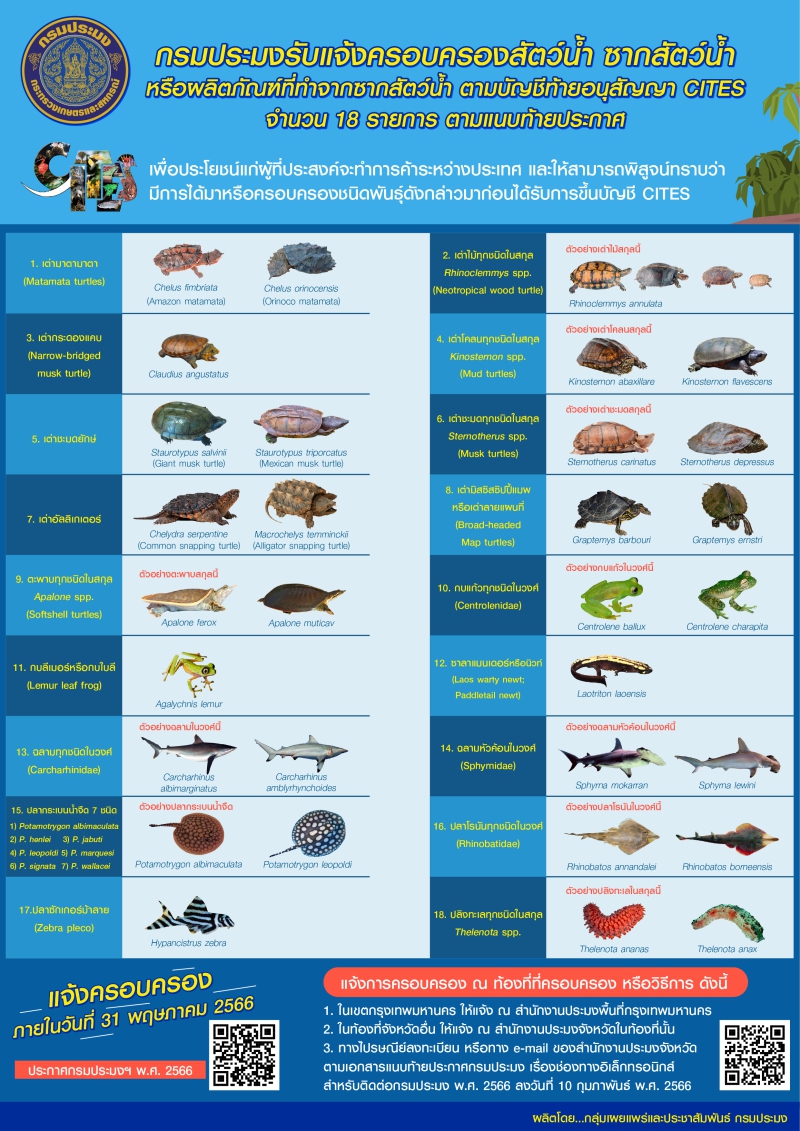 นายบัญชา สุขแก้ว รองอธิบดีกรมประมง เปิดเผยว่า ตามที่กรมประมงได้ออกประกาศให้ผู้มีไว้ในครอบครองซึ่งสัตว์น้ำ ซากสัตว์น้ำ หรือผลิตภัณฑ์ที่ทำจากซากสัตว์น้ำตามบัญชีท้ายอนุสัญญาว่าด้วยการค้าระหว่างประเทศซึ่งชนิดของสัตว์ป่าและพืชป่าที่ใกล้สูญพันธุ์ (CITES)มาแจ้งการมีไว้ในครอบครอง พ.ศ.2566 กับทางราชการให้แล้วเสร็จ ภายในวันที่ 31 พฤษภาคม 2566 โดยสัตว์น้ำ ซากสัตว์น้ำ หรือผลิตภัณฑ์ที่ทำจากซากสัตว์น้ำ จำนวน 18 รายการ ได้แก่ 1) เต่ามาตามาตา จำนวน 2 ชนิด : (1) Chelus fimbriata(2)Chelus orinocensis2)เต่าไม้ทุกชนิดในสกุลRhinoclemmys spp.3)เต่ากระดองแคบ Claudius angustatus4) เต่าโคลนทุกชนิดในสกุลKinostemon spp.(ยกเว้นชนิดที่อยู่ในบัญชี 1)5) เต่าชะมดยักษ์ จำนวน 2 ชนิด :(1) Staurotypus salvinil(2) Staurotypus triporcatus6)เต่าชะมดทุกชนิดในสกุลSternotherus spp.7) เต่าอัลลิเกเตอร์ จำนวน 2 ชนิด : (1)Chelydra serpentine(2) Macrochelys temminckii8) เต่ามิสซิสซิปปี้แมพ หรือเต่าลายแผนที่ จำนวน 5 ชนิด : (1)Graptemys barbori(2)Graptemysernstri(3)Graptemys gibbonsi(4)Graptemys pearlensis (5) Graptemys pulchra9) ตะพาบทุกชนิดในสกุลApalone spp. (ยกเว้นชนิดที่อยู่ในบัญชี 1)10) กบแก้วทุกชนิดในวงศ์Centrolenidae 11) กบลีเมอร์ หรือ กบใบลีสกุล Agalychnis lemur12) ซาลาแมนเดอร์ หรือ นิวท์(Lao warty newt) Laotrition laoensis13)ฉลามทุกชนิดในวงศ์ Carcharhinidae 14) ฉลามหัวค้อน ในวงศ์ Sphynidae 15) ปลากระเบนน้ำจืด จำนวน 7 ชนิด ได้แก่ (1) Poyamotrygon albimaculata / (2) Poyamotrygonhenlei / (3) Poyamotrygon jabuti / (4) Poyamotrygon leopoldi / (5) Poyamotrygon marquesi /(6) Poyamotrygon signata / (7) Poyamotrygon wallacei16) ปลาโรนันทุกชนิด ในวงศ์ Rhinobatidae 17) ปลาซักเกอร์ม้าลายHypancistrus zebra18) ปลิงทะเลทุกชนิด ในสกุล Thelenota spp.