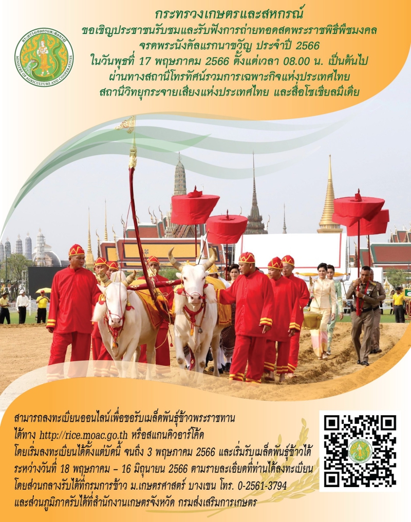 16 - 17 พฤษภาคม 2566 และนำไปบรรจุซองพลาสติก จำนวน 400,000 ซอง เพื่อแจกจ่ายให้ผู้สนใจและชาวนาทั่วประเทศ รับไปเป็นมิ่งขวัญและสิริมงคล