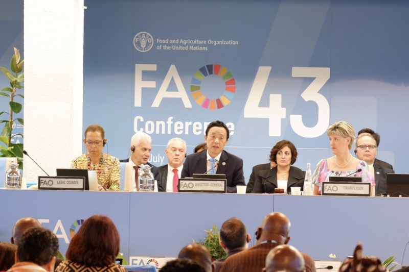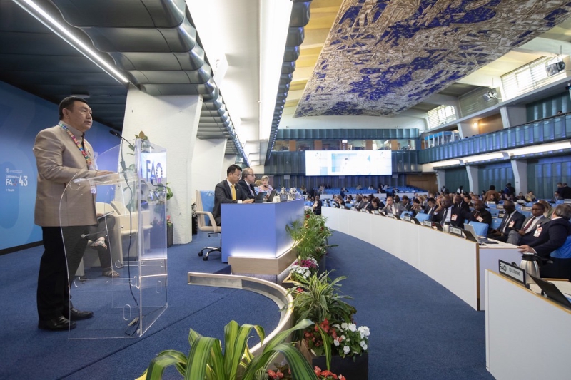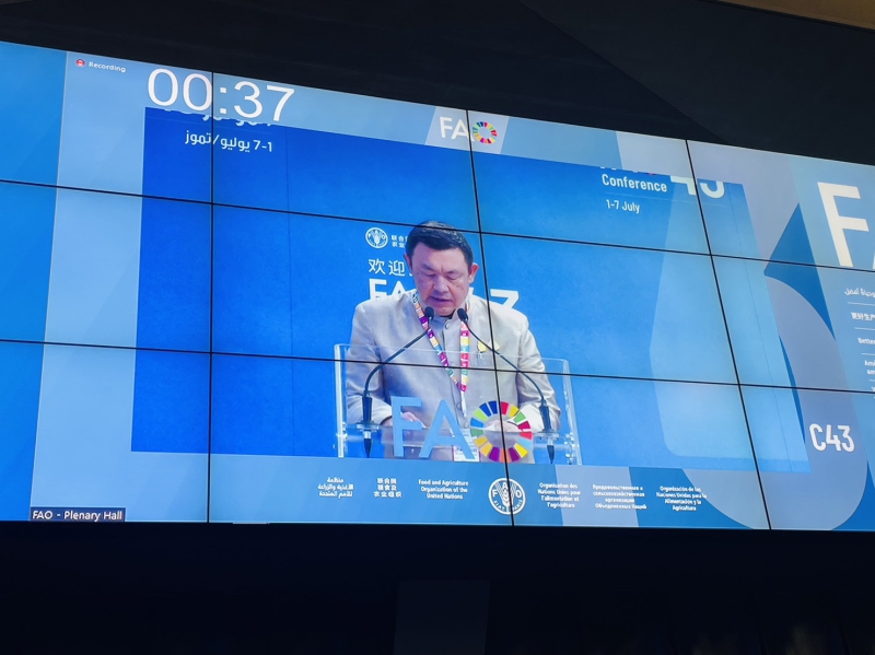 เมื่อวันที่ 3 กรกฎาคม 2566 เวลา 09.00 น. (ตามเวลาท้องถิ่น) ณ ห้องประชุม Plenary สำนักงานใหญ่ FAO กรุงโรม สาธารณรัฐอิตาลี นายเศรษฐเกียรติ กระจ่างวงษ์ รองปลัดกระทรวงเกษตรและสหกรณ์ พร้อมด้วยนายปราโมทย์ ยาใจ อธิบดีกรมพัฒนาที่ดิน ดร.วนิดา กำเนิดเพ็ชร์ ผู้อำนวยการสำนักการเกษตรต่างประเทศ นางสาวรัชนก แสงเพ็ญจันทร์ รักษาราชการแทนอัครราชทูตที่ปรึกษา (ฝ่ายเกษตร) และนางศุภจิต ศรีอริยวัฒน์ ที่ปรึกษา (ฝ่ายเกษตร) สำนักงานที่ปรึกษาการเกษตรต่างประเทศ ประจำกรุงโรม เข้าร่วมการประชุมสมัชชาใหญ่ FAO สมัยที่ 43 (The 43rd Session of the FAO Conference) ในวาระการประชุม Agenda Item 10 เรื่อง การรายงานสถานภาพการเกษตรและอาหารของโลก (Review of the State of Food and Agriculture) ภายใต้หัวข้อ “Water resources management for the four betters: better production, better nutrition, better environment and better life”