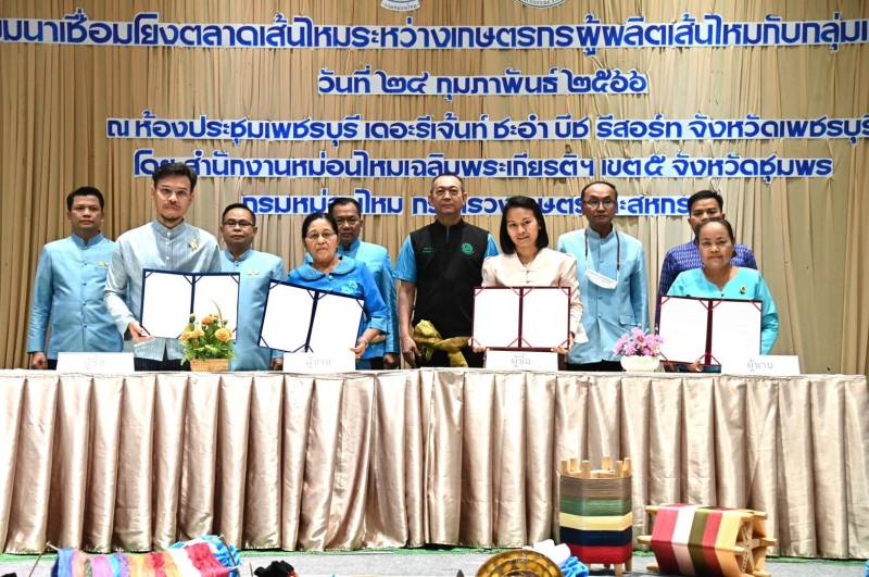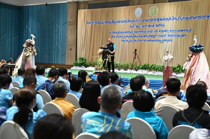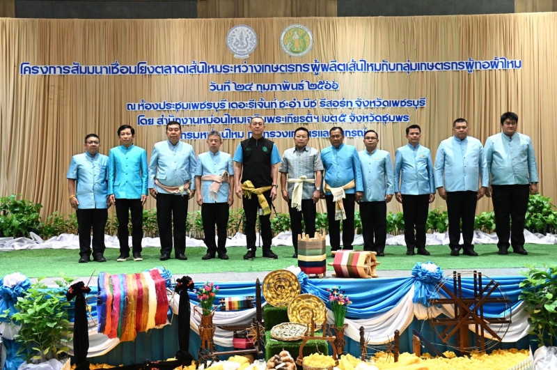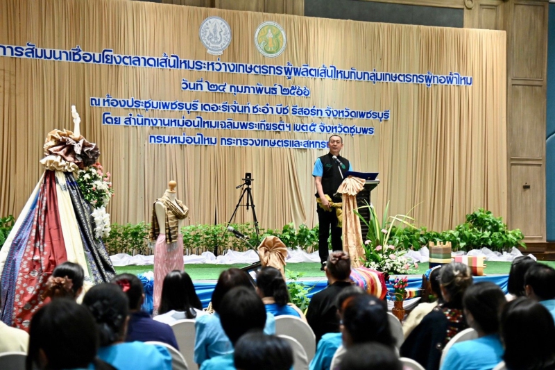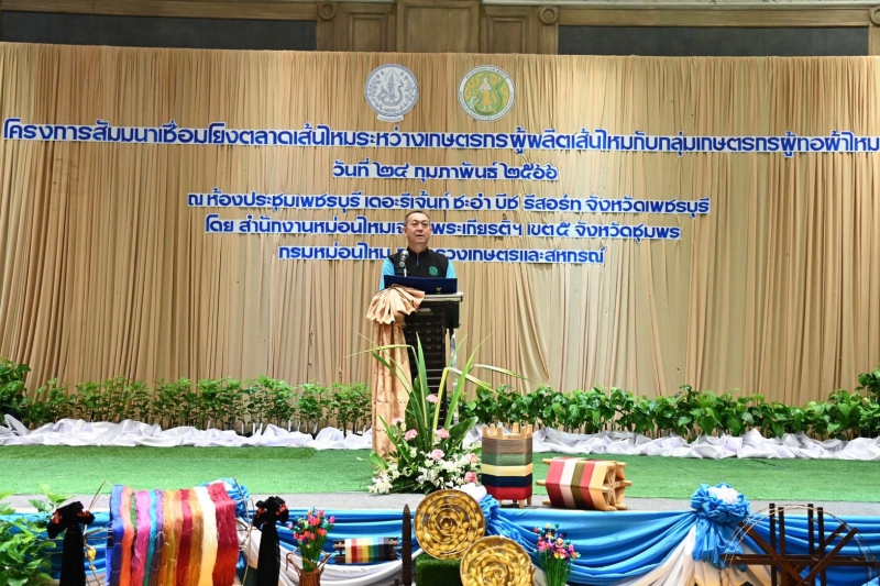 ดร.เฉลิมชัย ศรีอ่อน รัฐมนตรีว่าการกระทรวงเกษตรและสหกรณ์ เป็นประธานเปิดโครงการสัมมนาเชื่อมโยงตลาดเส้นไหมระหว่างเกษตรกรผู้ผลิตเส้นไหมกับกลุ่มเกษตรกรผู้ทอผ้าไหม และเป็นสักขีพยานการลงนามข้อตกลงซื้อขายเส้นไหมและผู้ทอผ้าไหม โดยมี นายสมเกียรติ กอไพศาล ประธานคณะทำงานรัฐมนตรีว่าการกระทรวงเกษตรและสหกรณ์ นายประกอบ เผ่าพงศ์ อธิบดีกรมหม่อนไหม และผู้บริหารกระทรวงเกษตรและสหกรณ์ เข้าร่วม ณ โรงแรมรีเจ้นท์ ชะอำ หัวหิน อำเภอชะอำ จังหวัดเพชรบุรี โดยการจัดงานดังกล่าวมีวัตถุประสงค์ เพื่อเชื่อมโยงเครือข่าย ระหว่างผู้ผลิตเส้นไหมซึ่งเป็นวัตถุดิบสำคัญในการผลิตผ้าไหม กับกลุ่มผู้ทอผ้าไหม ในเขตพื้นที่รับผิดชอบของสำนักงานฯ 27 จังหวัด ตั้งแต่จังหวัดสุพรรณบุรี อุทัยธานี จังหวัดภาคตะวันตก กรุงเทพมหานครและปริมณฑล ที่สำคัญ คือ 14 จังหวัดภาคใต้ ซึ่งมีกลุ่มทอผ้าและผู้ประกอบการทอผ้าไหมเป็นจำนวนมากกว่า 460 ราย มีความต้องการเส้นไหม ปีละกว่า 5 – 7 ตันต่อปี และเป็นที่ทราบกันโดยทั่วไปอยู่แล้วว่า เมื่อนำอาชีพการปลูกหม่อนเลี้ยงไหมที่เป็นอาชีพใหม่ในพื้นที่มาเปรียบเทียบกับอาชีพทางการเกษตรเดิมของพื้นที่ภาคใต้ ทั้งด้านประมง ปศุสัตว์ และพืชเศรษฐกิจหลัก เช่น ทุเรียน ผลไม้อื่น ๆ ปาล์มน้ำมัน และยางพารา ที่ทำรายได้ให้กับประชาชนภาคใต้มาอย่างยาวนาน การที่จะขยายพื้นที่ปลูกหม่อนเลี้ยงไหมและผลิตเส้นไหมในพื้นที่ให้เพียงพอกับความต้องการจึงเป็นข้อจำกัดหนึ่ง ซึ่งต้องอาศัยระยะเวลาพอสมควรในการสร้างความร่วมมือและขยายอาชีพหม่อนไหมสู่ชุมชน