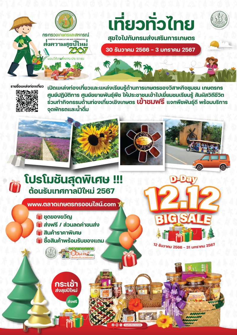 2) กิจกรรมเพิ่มสุขปีใหม่ เที่ยวทั่วไทย สุขใจไปกับกระทรวงเกษตรและสหกรณ์ โดยกรมส่งเสริมการเกษตร และหน่วยงานภายใต้กำกับของกรมส่งเสริมการเกษตร ร่วมกับวิสาหกิจชุมชน และกลุ่มเกษตรกรที่มีความพร้อม กว่า 87 แห่ง ร่วมเปิดแหล่งท่องเที่ยวและแหล่งเรียนรู้ด้านการเกษตร ระหว่างวันที่ 30 ธันวาคม 2566 - 3 มกราคม 2567 รอต้อนรับประชาชนเข้าไปเยี่ยมชม เรียนรู้ สัมผัสวิถีชีวิต และทำกิจกรรมด้านท่องเที่ยวเชิงเกษตร พร้อมให้บริการจุดพักรถและน้ำดื่ม โดยเฉพาะที่ศูนย์ขยายพันธุ์พืช 4 แห่ง ซึ่งเตรียมต้นพืชพันธุ์ดีหลากหลายชนิดไว้มอบให้แก่ผู้ที่สนใจ สามารถขอรับได้ฟรี ไม่มีค่าใช้จ่าย