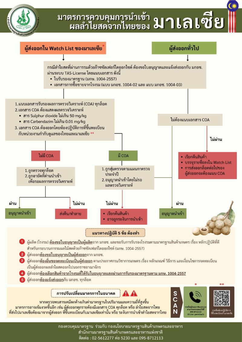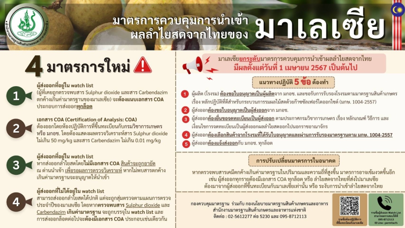 นายพิศาล พงศาพิชณ์ เลขาธิการสำนักงานมาตรฐานสินค้าเกษตรและอาหารแห่งชาติ (มกอช.) เปิดเผยว่าในปี 2566 ที่ผ่านมา กระทรวงสาธารณสุขมาเลเซียตรวจพบสารตกค้างในผลลำไยสดนำเข้าจากไทยเกินค่ามาตรฐานบ่อยครั้ง ซึ่งไทยส่งออกลำไยสดไปมาเลเซียในปีดังกล่าวจำนวนกว่า 9,089 ตัน คิดเป็นมูลค่ากว่า 270 ล้านบาท ทำให้มาเลเซียประกาศใช้มาตรการใหม่ กำหนดให้ผู้ส่งออกที่เคยถูกตรวจพบว่ามีสารตกค้างเกินค่ามาตรฐาน หรือเรียกว่าอยู่ในรายชื่อเฝ้าระวัง (Watch List) จะต้องมีเอกสารรับรองผลการตรวจวิเคราะห์ หรือ COA ที่แสดงว่ามีสารซัลเฟอร์ไดออกไซด์ และ Carbendazim ตกค้างไม่เกินค่ามาตรฐานของมาเลเซีย ประกอบการนำเข้าสินค้าทุกล็อต โดยหากไม่มีเอกสารดังกล่าว สินค้าจะถูกอายัดที่ด่านนำเข้าเพื่อรอผลการตรวจ หากไม่พบสารตกค้างเกินค่ามาตรฐาน จึงจะอนุญาตให้นำเข้าได้ โดยจะเริ่มมีผลบังคับใช้ตั้งแต่วันที่ 1 เมษายน 2567 เป็นต้นไป