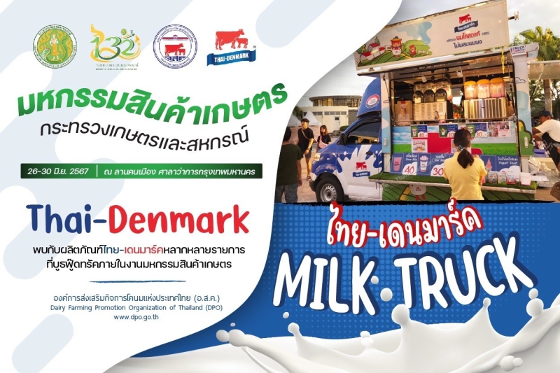 นายสมพร ศรีเมือง ผู้อำนวยการองค์การส่งเสริมกิจการโคนมแห่งประเทศไทย (อ.ส.ค.) กล่าวว่าเพื่อเป็นการประชาสัมพันธ์ผลิตภัณฑ์นมไทย-เดนมาร์คให้เป็นที่รู้จักอย่างกว้างขวางมากยิ่งขึ้น ประกอบกับต้องการให้ประชาชนได้ดื่มนมที่มีคุณภาพในราคาย่อมเยา ซึ่ง อ.ส.ค.ได้เข้าร่วมจำหน่ายผลิตภัณฑ์ภายในงาน “มหกรรมสินค้าเกษตร” เกษตรพากิน พาเที่ยว @ลานคนเมือง ซึ่งกระทรวงเกษตรและสหกรณ์ได้จัดขึ้นระหว่างวันที่ 26 - 30 มิถุนายน 2567 ณ ลานคนเมือง ศาลาว่าการกรุงเทพมหานคร โดยจะนำรถไทย-เดนมาร์ค Milk Truck จำหน่ายผลิตภัณฑ์ภายใต้ตราสินค้าไทย-เดนมาร์ค อาทิเช่น เมนูชงกว่า 20 เมนู อาทิ Brown Sugar เยลลี่บุก, Strawberry Choco, Cocoa Mint, Banan Cocoa และนมสตอเบอร์รี่ วิปปิ้งครีม เป็นต้น อีกทั้งยังมีผลิตภัณฑ์นมพาสเจอร์ไรส์ ไอศกรีมนมโคแท้ โยเกิร์ตพร้อมดื่มพาสเจอร์ไรส์ ผลิตภัณฑ์นมยูเอชที โอเมก้า 369 พลัส ผลิตภัณฑ์นมยูเอชทีปราศจากน้ำตาลแลคโตส รสจืด โอเมก้าพลัส ผลิตภัณฑ์โยเกิร์ตอบกรอบ Yogurt Freez Dry และผลิตภัณฑ์นมปรุงแต่งอัดเม็ด(รสหวาน) ให้ประชาชนได้ซื้อภายในงาน ผลิตภัณฑ์ทุกชนิดผลิตจากนมโคแท้ 100% ไม่ผสมนมผง ผู้บริโภคมั่นใจได้ว่าได้ดื่มนมที่มีคุณภาพ มีสารอาหารครบถ้วนอย่างแน่นอน