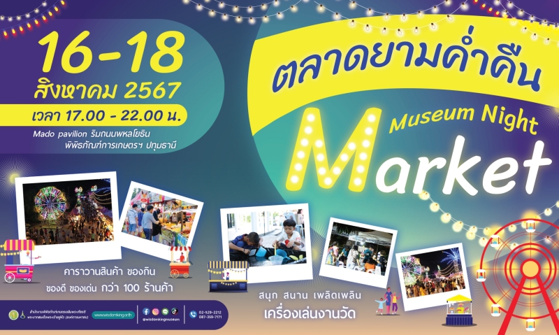 มาสนุกต่อกับกิจกรรมที่ 3 สัมผัสประสบการณ์สุดพิเศษ ตระการตากับแสง สี เสียง ในงาน“ตลาดยามค่ำ Museum Night Market” ระหว่างวันที่ 16 – 18 สิงหาคมนี้ จูงมือแม่เที่ยวตลาดยามค่ำคืน ย้อนยุคไปกับบรรยากาศงานวัดและกิจกรรรมมากมาย อาทิ ชิงช้าสวรรค์ ล้วงไห ตักปลา ชม ช้อปไปกับคาราวานสินค้าของดีของเด่นกว่า 100 ร้านค้า ตั้งแต่เวลา 17.00 – 22.00 น. ณ Mado Pavilion (ริมถนนพหลโยธิน) พิพิธภัณฑ์การเกษตรเฉลิมพระเกียรติฯ