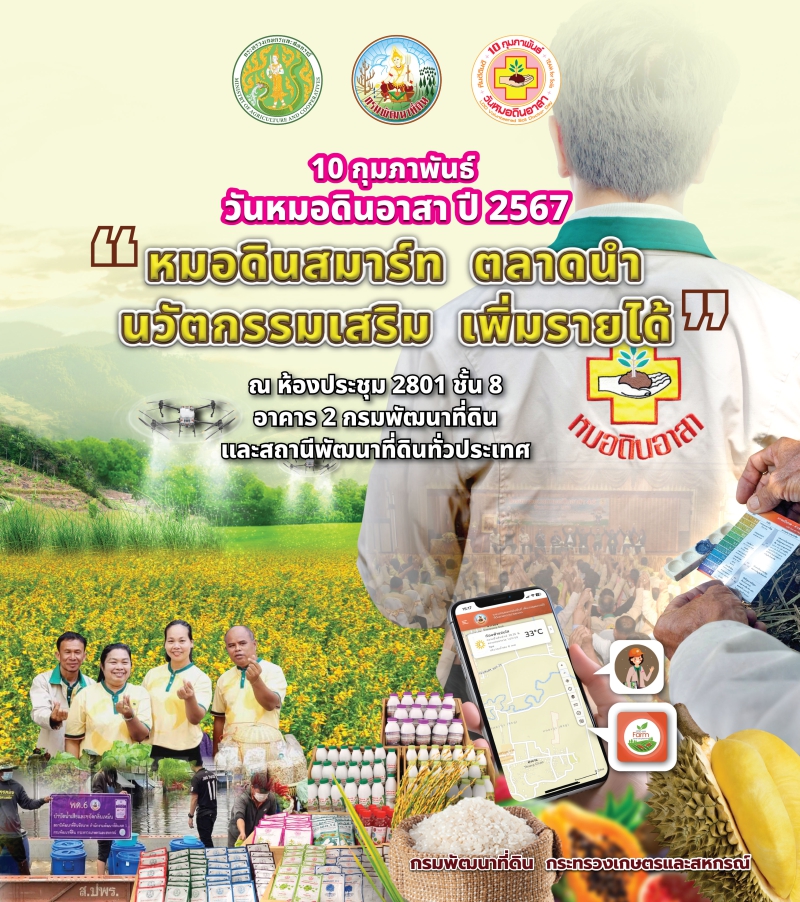 นายปราโมทย์ ใจ อธิบดีกรมพัฒนาที่ดิน เปิดเผยว่า กรมพัฒนาที่ดิน เตรียมจัดงาน “วันหมอดินอาสา กรมพัฒนาที่ดิน” ปี 2567 วันเสาร์ที่ 10 กุมภาพันธ์ 2567 ภายใต้หัวข้อ “หมอดินสมาร์ท ตลาดนำ นวัตกรรมเสริม เพิ่มรายได้” สอดรับนโยบายตลาดนำ นวัตกรรมเสริม เพิ่มรายได้ ของกระทรวงเกษตรและสหกรณ์ มุ่งสร้างความเข้มแข็งทางด้านการผลิตให้หมอดินอาสาซึ่งเป็นผู้ประกอบการ ผลิตพืชตามความต้องการของตลาด ด้วยเทคโนโลยีนวัตกรรมของกรมพัฒนาที่ดิน สร้างรายได้ เพื่อพัฒนาศักยภาพหมอดินอาสาอย่างมืออาชีพ โดยจัดขึ้นพร้อมกันทั่วประเทศ (77 จังหวัด) โดยมีศูนย์กลางการจัดงาน ณ กรมพัฒนาที่ดิน เขตจตุจักร กรุงเทพฯ