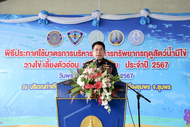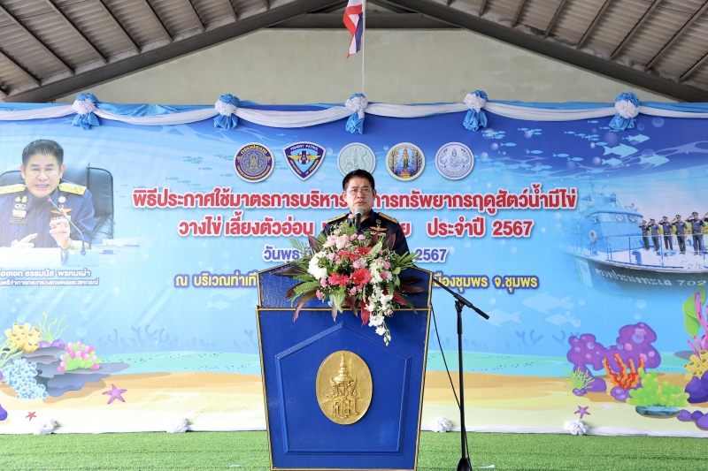 ร้อยเอก ธรรมนัส พรหมเผ่า รัฐมนตรีว่าการกระทรวงเกษตรและสหกรณ์ เป็นประธานใน “พิธีประกาศใช้มาตรการบริหารจัดการทรัพยากรสัตว์น้ำมีไข่ วางไข่ เลี้ยงตัวอ่อน พื้นที่ทะเลอ่าวไทย ประจำปี 2567” ณ ท่าเทียบเรือประมงชุมพร ตำบลปากน้ำ อำเภอเมือง จังหวัดชุมพร ซึ่งมาตรการดังกล่าว ยังคงเป็นมาตรการที่กระทรวงเกษตรฯ โดยกรมประมงดำเนินการมาอย่างต่อเนื่องเป็นประจำทุกปี ครอบคลุมพื้นที่บริเวณอ่าวไทย โดยแบ่งเป็นบริเวณพื้นที่อ่าวไทยตอนกลาง 2 ช่วงระยะเวลา ได้แก่ ระหว่างวันที่ 15 กุมภาพันธ์ – 15 พฤษภาคม 2567 ตั้งแต่ปลายแหลมเขาม่องไล่ จังหวัดประจวบคีรีขันธ์ ถึงอำเภอดอนสัก จังหวัดสุราษฎร์ธานี และระหว่างวันที่ 16 พฤษภาคม – 14 มิถุนายน 2567 ในบริเวณอาณาเขตตามแผนที่แนบท้ายของประกาศปิดอ่าวไทยตอนกลางและเขตต่อเนื่องตั้งแต่ปลายแหลมเขาม่องไล่ ถึงอำเภอหัวหิน จังหวัดประจวบคีรีขันธ์ ตามแผนที่แนบท้ายของประกาศปิดอ่าวประจวบ และบริเวณพื้นที่อ่าวไทยรูปตัว ก 2 ช่วงระยะเวลา ได้แก่ ระหว่างวันที่ 15 มิถุนายน – 15 สิงหาคม 2567 ในพื้นที่อ่าวไทยตอนในฝั่งตะวันตกของจังหวัดประจวบคีรีขันธ์ เพชรบุรี สมุทรสงคราม และสมุทรสาคร และระหว่างวันที่ 1 สิงหาคม – 30 กันยายน 2567 ในพื้นที่อ่าวไทยตอนในด้านเหนือของจังหวัดสมุทรสาคร กรุงเทพมหานคร สมุทรปราการ ฉะเชิงเทรา และชลบุรี โดยมีวัตถุประสงค์เพื่อฟื้นฟูและบริหารจัดการทรัพยากรสัตว์น้ำฝั่งทะเลอ่าวไทยซึ่งเป็นแหล่งวางไข่และอาศัยเลี้ยงตัวอ่อนของสัตว์น้ำหลายชนิด ด้วยการคุ้มครองพ่อแม่พันธุ์สัตว์น้ำที่มีความสมบูรณ์เพศพร้อมผสมพันธุ์วางไข่ และปกป้องสัตว์น้ำวัยอ่อนให้มีโอกาสเจริญเติบโตเป็นสัตว์น้ำรุ่นต่อไป