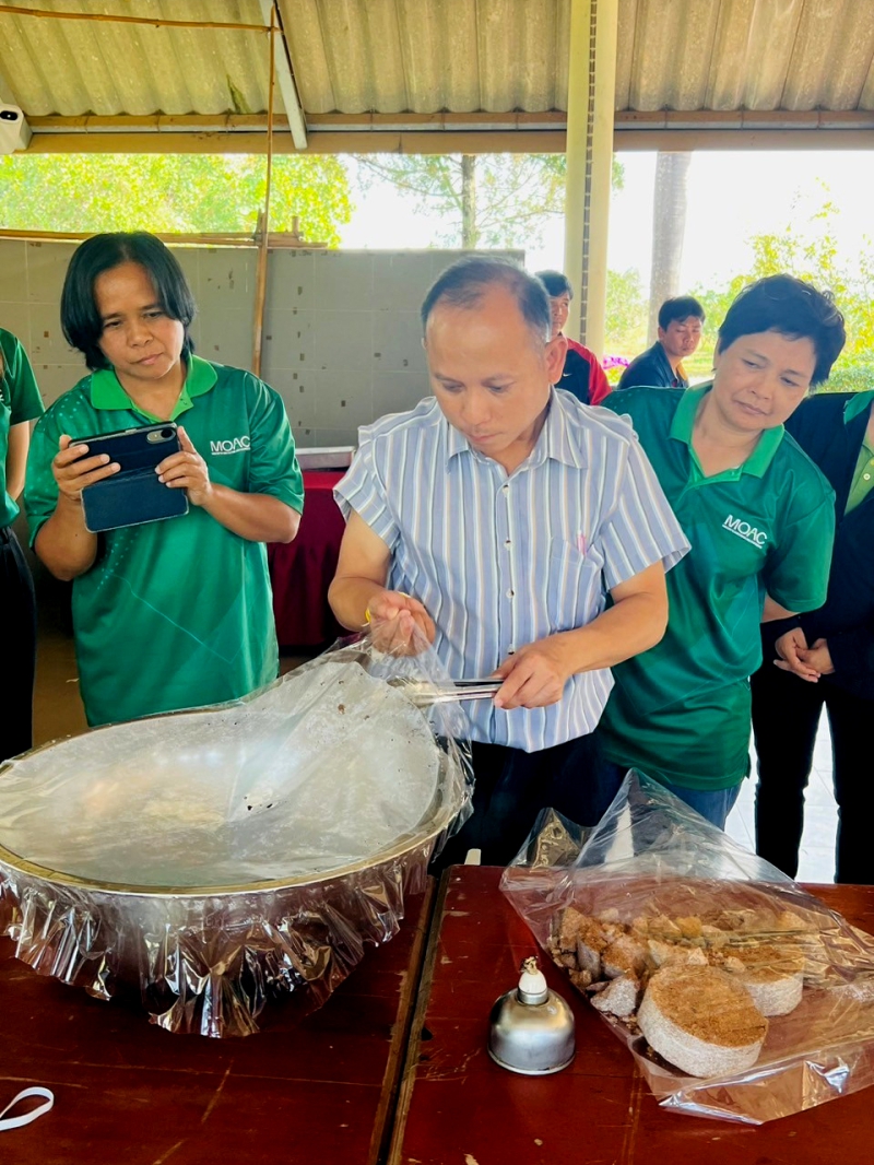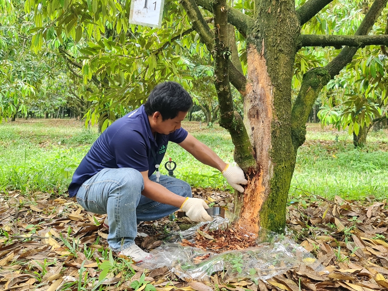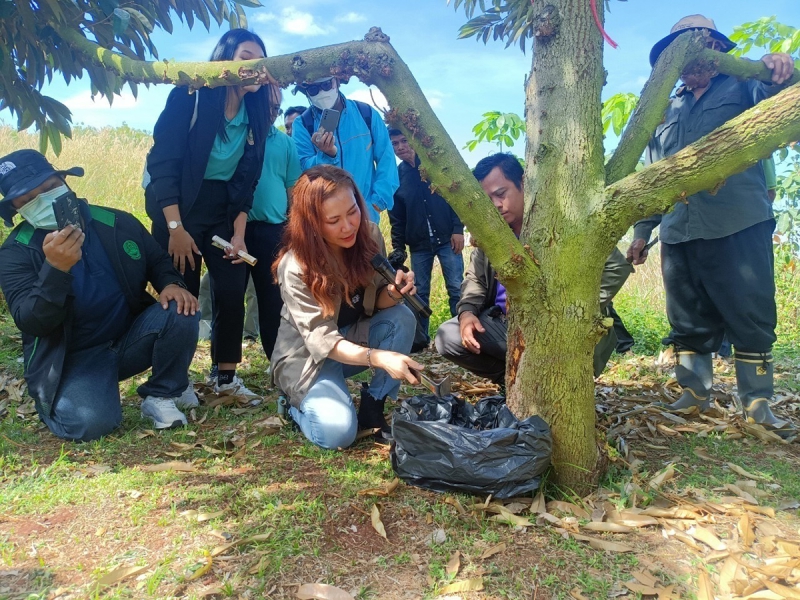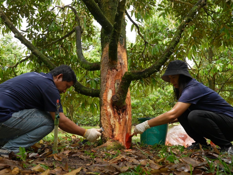 ดร.สุรีย์พร บัวอาจ นักวิชาการโรคพืชชำนาญการพิเศษ สำนักวิจัยพัฒนาการอารักขาพืชให้ข้อมูลว่า โรครากเน่าและโคนเน่าในทุเรียน มีสาเหตุมาจากเชื้อราไฟทอปธอร่า (Phytophthora palmivora) ซึ่งสามารถแพร่กระจายในดินและเข้าทำลายราก ตลอดจนลำต้นของต้นทุเรียน ทำให้ต้นอ่อนแอ ใบเหลือง ร่วง และอาจถึงขั้นยืนต้นตายหากไม่ได้รับการป้องกันอย่างเหมาะสม โรคนี้นับเป็นปัญหาสำคัญที่ส่งผลกระทบต่อการผลิตทุเรียนอย่างรุนแรง สร้างความเสียหายเป็นวงกว้าง ทั้งในแง่ของผลผลิตและรายได้ของเกษตรกร ในขณะที่เทคโนโลยีการใช้เห็ดเรืองแสงสิรินรัศมี ได้รับการยอมรับอย่างกว้างขวางจากทั้งนักวิชาการและเกษตรกร เนื่องจากมีขั้นตอนการผลิตที่ง่าย ไม่ซับซ้อน และสามารถนำไปใช้ทดแทนสารเคมีได้อย่างมีประสิทธิภาพ