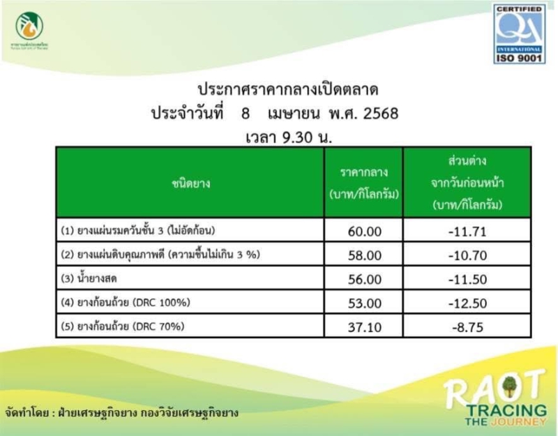 ทั้งนี้ หากนำไปเปรียบเทียบกับราคายางในช่วงวันที่ 8 เม.ย. 68 ที่ราคากลางเปิดตลาด 1) ยางแผ่นรมควันชั้น 3 (ไม่อัดก้อน) อยู่ที่ราคา 60 บาทต่อกิโลกรัม 2) ยางแผ่นดิบคุณภาพดี (ความชื้นไม่เกิน 3%) ราคา 58 บาทต่อกิโลกรัม 3) น้ำยางสด ราคา 56 บาทต่อกิโลกรัม 4) ยางก้อนถ้วย (DRC 100%) ราคา 53 บาทต่อกิโลกรัม และ 5) ยางก้อนถ้วย (DRC 70%) ราคาปรับลงมาเหลือ 37.10 บาทต่อกิโลกรัม ซึ่งจะเห็นได้ชัดว่าราคายางขยับตัวสูงขึ้นอย่างต่อเนื่องทุกวัน