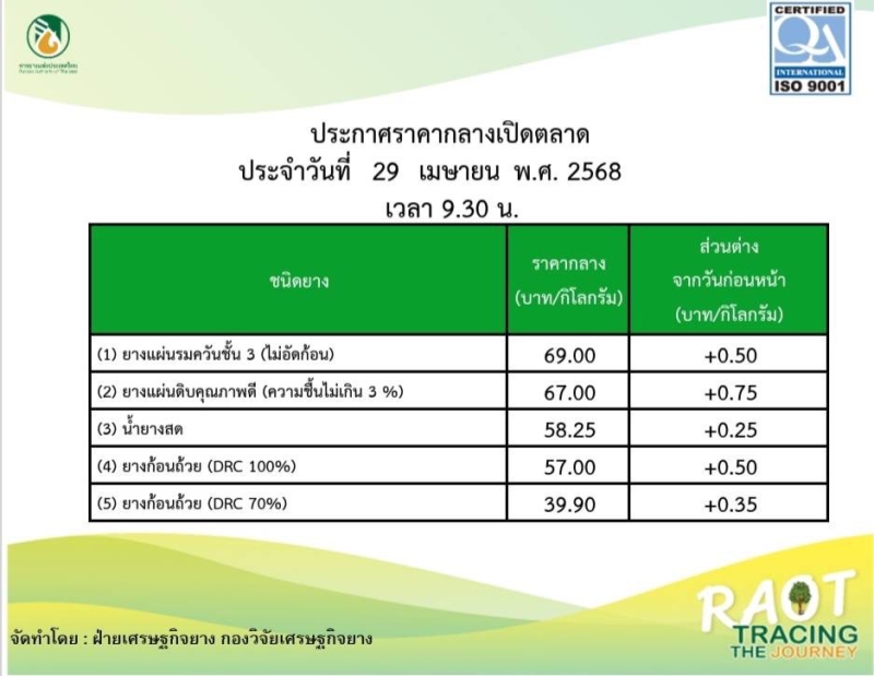 ศ.ดร.นฤมล กล่าวต่อว่า ล่าสุดราคายางพาราทุกชนิดได้ปรับขึ้นมาอย่างต่อเนื่อง โดยราคากลางเปิดตลาดวันนี้ (29 เม.ย. 68) 1) ยางแผ่นรมควันชั้น 3 (ไม่อัดก้อน) ราคา 69 บาทต่อกิโลกรัม 2) ยางแผ่นดิบคุณภาพดี (ความชื้นไม่เกิน 3%) ราคา 67 บาทต่อกิโลกรัม 3) น้ำยางสด ราคา 58.25 บาทต่อกิโลกรัม 4) ยางก้อนถ้วย (DRC 100%) ราคา 57 บาทต่อกิโลกรัม และ 5) ยางก้อนถ้วย (DRC 70%) ราคาปรับลงมาเหลือ 39.90 บาทต่อกิโลกรัม