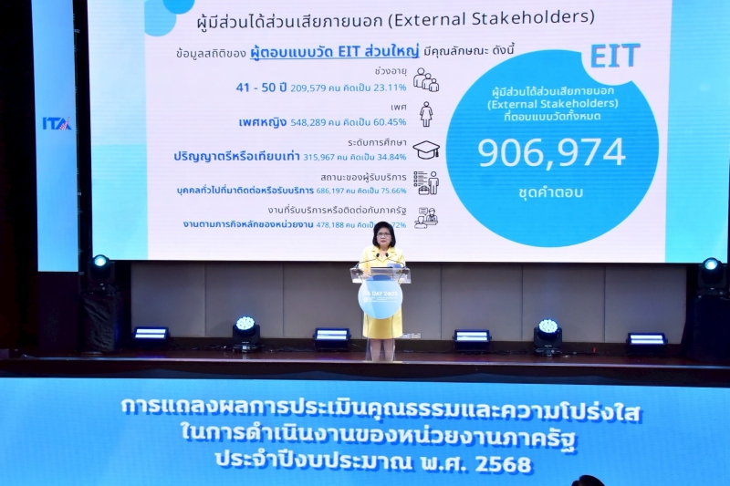สำหรับการประเมิน ITA และรางวัล ITA Awards 2025 สะท้อนถึงบทบาทของทุกภาคส่วนที่ร่วมกันขับเคลื่อนสังคมให้ดีขึ้น ซึ่งมีวัตถุประสงค์เพื่อสร้างแรงจูงใจแก่หน่วยงานภาครัฐในการพัฒนาองค์กรตามหลักธรรมาภิบาล และเสริมสร้างให้เกิดกระแสการไม่ทนต่อการทุจริต มีหน่วยงานภาครัฐเข้าร่วมการประเมินทั้งสิ้น 8,317 หน่วยงาน และมีผู้ตอบแบบวัดการรับรู้ของผู้มีส่วนได้ส่วนเสียมากกว่า 1.35 ล้านความคิดเห็น โดยผลการประเมินภาพรวมระดับประเทศอยู่ที่ 93.82 คะแนน เพิ่มขึ้นจากปีก่อน 0.77 คะแนน และสูงกว่าค่าเป้าหมายตามแผนแม่บทภายใต้ยุทธศาสตร์ชาติ (21) ประเด็นการต่อต้านการทุจริตและประพฤติมิชอบ โดยมีหน่วยงานที่คะแนนผ่านเกณฑ์ จำนวน 7,832 หน่วยงาน คิดเป็น 94.17% ของหน่วยงานทั้งหมดที่เข้ารับการประเมิน ซึ่งเพิ่มขึ้นจากปีก่อน 1.73% นอกจากนี้ ประเด็นความสำเร็จที่เห็นได้ชัดเจน คือ ผลคะแนนรายตัวชี้วัดที่มีคะแนนเฉลี่ยสูงกว่าปีที่แล้วถึง 8 จาก 10 ตัวชี้วัด โดยเฉพาะตัวชี้วัดที่ 3 การใช้อำนาจ ซึ่งได้คะแนนสูงสุดถึง 99.45 คะแนน และตัวชี้วัดที่ 8 การปรับปรุงระบบการทำงาน คะแนนเฉลี่ย 94.39 คะแนน ซึ่งสูงกว่าปีก่อนถึง 9.9 คะแนน