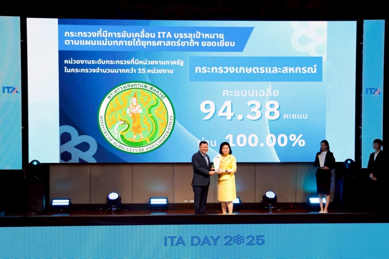 นายประยูร อินสกุล ปลัดกระทรวงเกษตรและสหกรณ์ เปิดเผยภายหลังร่วมงานประกาศผลการประเมินคุณธรรมและความโปร่งใสในการดำเนินงานของหน่วยงานภาครัฐ (Integrity and Transparency Assessment : ITA) ประจำปีงบประมาณ พ.ศ. 2568 และพิธีมอบรางวัล ITA Awards 2025ภายใต้แนวคิด “ACTIVE FOR CHANGE โปร่งใส ขับเคลื่อน เปลี่ยนแปลง” โดยมีนางสุวณา สุวรรณจูฑะ กรรมการ ป.ป.ช. ในฐานะประธานกรรมการประเมินคุณธรรมและความโปร่งใส เป็นประธาน พร้อมด้วยนางอัญชลี สุวจิตตานนท์ รองปลัดกระทรวงเกษตรและสหกรณ์ และผู้แทนหน่วยงานที่เกี่ยวข้องร่วมเป็นเกียรติภายในงาน ณ สำนักงานคณะกรรมการป้องกันและปราบปรามการทุจริตแห่งชาติ (ป.ป.ช.) ว่า กระทรวงเกษตรและสหกรณ์ได้รับรางวัลโล่เกียรติยศ ITA Awards 2025 รางวัลประเภทที่ 3 รางวัลระดับกระทรวงที่มีหน่วยงานภาครัฐในกระทรวงจำนวนมากกว่า 15 หน่วยงาน ที่มีการขับเคลื่อน ITA บรรลุเป้าหมายตามแผนแม่บทภายใต้ยุทธศาสตร์ชาติฯ ยอดเยี่ยม ด้วยคะแนนเฉลี่ย 94.38 คะแนน โดย 22 หน่วยงานในสังกัดและในกำกับของกระทรวงเกษตรและสหกรณ์ ได้คะแนนประเมิน ITA 85 คะแนนขึ้นไป ร้อยละ 100 ซึ่งเป็นความภาคภูมิใจของผู้บริหารและบุคลากรกระทรวงเกษตรและสหกรณ์ในการปฏิบัติหน้าที่ด้วยความสุจริต โปร่งใส และเป็นธรรม บนหลักการการบริหารจัดการองค์กรอย่างมีธรรมาภิบาลและได้มาตรฐานเพื่อสร้างความเชื่อมั่นต่อผู้รับบริการและผู้ที่มีส่วนได้ส่วนเสียทุกภาคส่วน ทั้งนี้ กระทรวงเกษตรและสหกรณ์จะเดินหน้าพัฒนาและยกระดับการทำงานเพื่อประโยชน์สูงสุดของพี่น้องเกษตรกรและประชาชนต่อไป