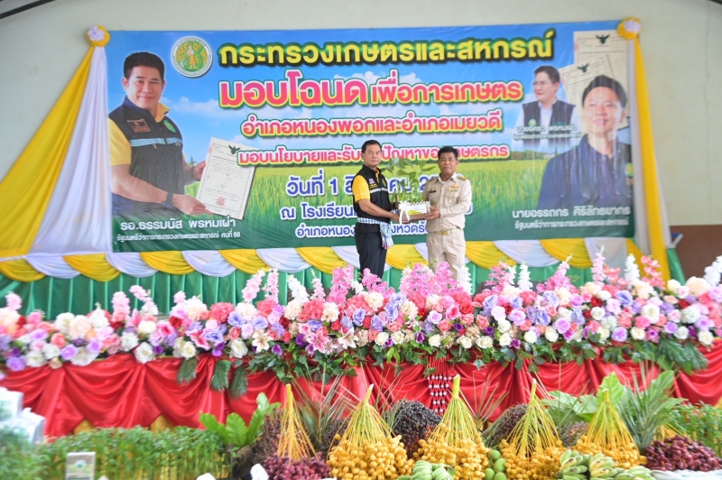 นายอรรถกร ศิริลัทธยากร รัฐมนตรีว่าการกระทรวงเกษตรและสหกรณ์ กล่าวภายหลังลงพื้นที่พบปะและรับฟังปัญหาของเกษตรกรในพื้นที่จังหวัดร้อยเอ็ด และเป็นประธานพิธีมอบโฉนดเพื่อการเกษตร ให้กับเกษตรกรกว่า 2,000 ราย เนื้อที่รวมประมาณ 20,127 ไร่ และมอบโฉนดต้นยาง จำนวน 100 ฉบับ ณ โรงเรียนหนองพอกวิทยาลัย ต.รอบเมือง อ.หนองพอก และ หอประชุมที่ว่าการอำเภอโพธิ์ชัย ต.ขามเบี้ย อ.โพธิ์ชัย จ.ร้อยเอ็ด ว่า โฉนดเพื่อการเกษตร เป็นนโยบายสำคัญของกระทรวงเกษตรและสหกรณ์ ที่มุ่งเน้นให้เกษตรกรสามารถใช้ประโยชน์จากสินทรัพย์ เพื่อสร้างโอกาสในการมีอาชีพ มีรายได้ และมีความมั่นคงในชีวิต เป็นการพัฒนาสิทธิและเพิ่มมูลค่าในที่ดินรัฐให้แก่เกษตรกร ให้สามารถนำไปต่อยอดในการเข้าถึงแหล่งเงินทุนได้เพิ่มมากขึ้น มีทางเลือกในการพัฒนาที่ดินและพัฒนาอาชีพของตนเอง ขณะเดียวกัน กระทรวงเกษตรฯ ได้เดินหน้าผลักดันโครงการโฉนดต้นไม้และโฉนดต้นยาง ควบคู่ไปกับที่ดิน ส.ป.ก. เพื่อพัฒนาศักยภาพให้เป็นสินทรัพย์ ใช้เป็นหลักประกันในระบบสินเชื่อ เชื่อมโยงกับสถาบันการเงิน เพื่อเป็นการสร้างคุณค่าให้เพิ่มขึ้นอีกด้วย
