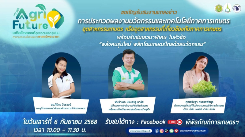 วันที่ 6 กันยายน 2568 สำนักงานพิพิธภัณฑ์เกษตรเฉลิมพระเกียรติพระบาทสมเด็จพระเจ้าอยู่หัว (องค์การมหาชน) หรือ พกฉ. ร่วมกับ สำนักงานพัฒนาการวิจัยการเกษตร (องค์การมหาชน) หรือ สวก. จัดงานแถลงข่าวโครงการ Young Agri Future 2025 เวทีสร้างสรรค์ผลงานนวัตกรรมและเทคโนโลยีการเกษตร ถ่ายทอดพลังแห่งศาสตร์พระราชา ณ ห้องประชุมศาสตร์พระราชา อาคารสำนักงานพิพิธภัณฑ์เกษตรฯ