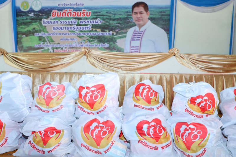 โอกาสนี้ ร้อยเอก ธรรมนัส ได้มอบถุงยังชีพจากมูลนิธิธรรมนัส พรหมเผ่า เพื่อการกุศล และสุขาลอยน้ำ จากสำนักงานคณะกรรมการการอาชีวศึกษา ซึ่งจัดสร้างโดยวิทยาลัยเทคนิคพระนครศรีอยุธยา ให้แก่ประชาชนที่ได้รับผลกระทบจากน้ำท่วมด้วย