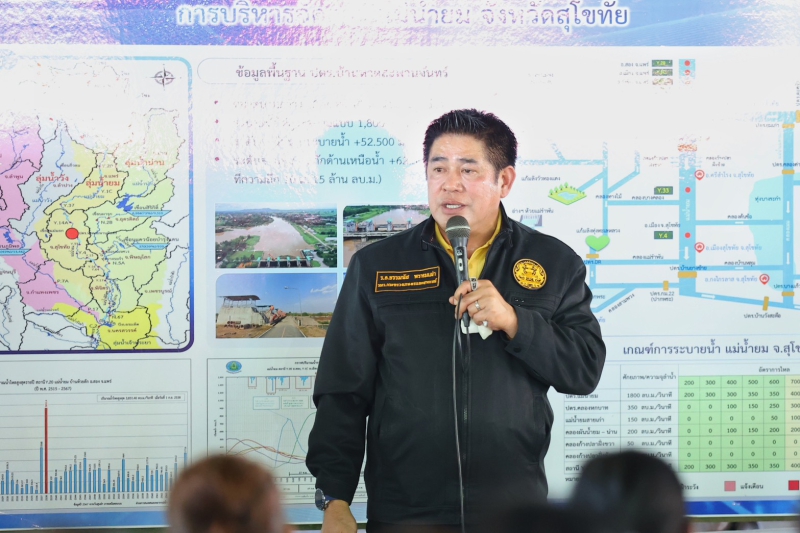 สำหรับในปี 2568 จังหวัดสุโขทัยประสบอุทกภัยจากพายุแล้ว 3 ลูก ได้แก่ “วิภา” “ฮาจิกิ” และ “บัวลอย” ส่งผลกระทบต่อพื้นที่เกษตรกว่า 46,000 ไร่ ประชาชนกว่า 5,000 ครัวเรือน ได้รับผลกระทบ คิดเป็นมูลค่าความเสียหายรวมกว่า 17 ล้านบาท ทั้งนี้ จังหวัดสุโขทัยมีข้อจำกัดด้านการบริหารจัดการน้ำ เนื่องจากแม่น้ำยมไม่มีเขื่อนหรืออ่างเก็บน้ำรองรับ ทำให้มวลน้ำจากจังหวัดพะเยาและแพร่ไหลเข้าสู่พื้นที่ด้วยอัตราสูงสุดกว่า 1,400 ลูกบาศก์เมตรต่อวินาที ส่งผลให้จังหวัดสุโขทัยต้องรับมวลน้ำหลากในทุกปี ขณะที่ปัจจุบันระดับน้ำในแม่น้ำยมมีแนวโน้มลดลงอย่างต่อเนื่อง จึงได้กำชับให้กรมชลประทานเตรียมประสานงานกับหน่วยงานท้องถิ่นที่เกี่ยวข้อง นำเครื่องจักรเครื่องมือเข้าดำเนินการซ่อมแซมจุดที่ได้รับความเสียหาย เสริมคันดินในพื้นที่เสี่ยง พร้อมติดตั้งเครื่องสูบน้ำเพื่อเร่งระบายน้ำออกจากพื้นที่น้ำท่วมขังอย่างต่อเนื่อง ขณะเดียวกันยังคงเฝ้าระวังและติดตามสถานการณ์น้ำในพื้นที่อย่างใกล้ชิดจนกว่าสถานการณ์จะกลับเข้าสู่ภาวะปกติ